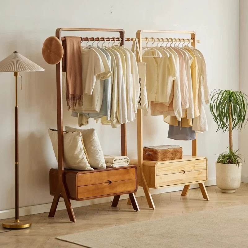 Solid Wood Freestanding Coat Rack with Drawer - Versatile Bedroom Accessory, Sitting and Drying Clothes Stand, Bedside Storage Solution, Stylish and Functional Coat and Hat Organizer with Storage Options