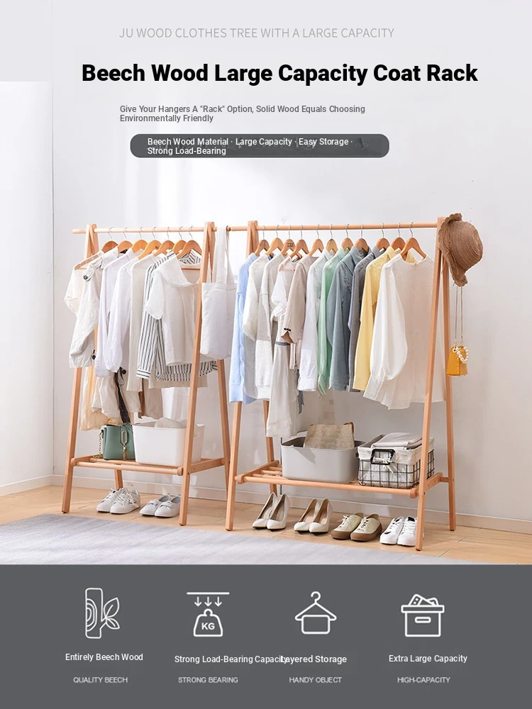 Solid Wood Clothes Rack - Stylish Freestanding Coat Hanger for Bedroom, Simple Beech Wood Garment Stand, Perfect for Organizing and Drying Clothes at Home.