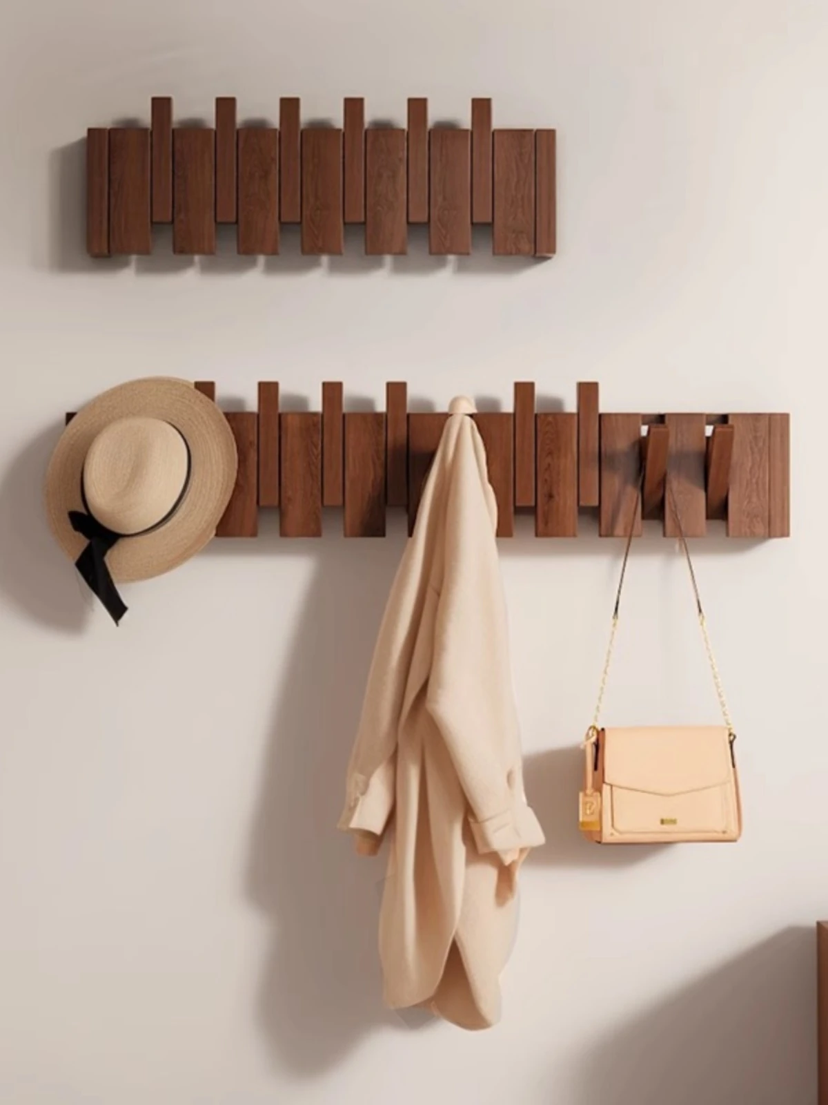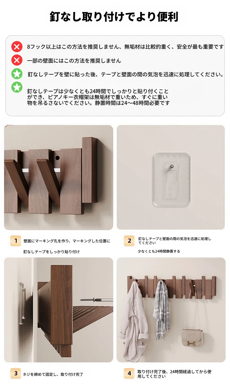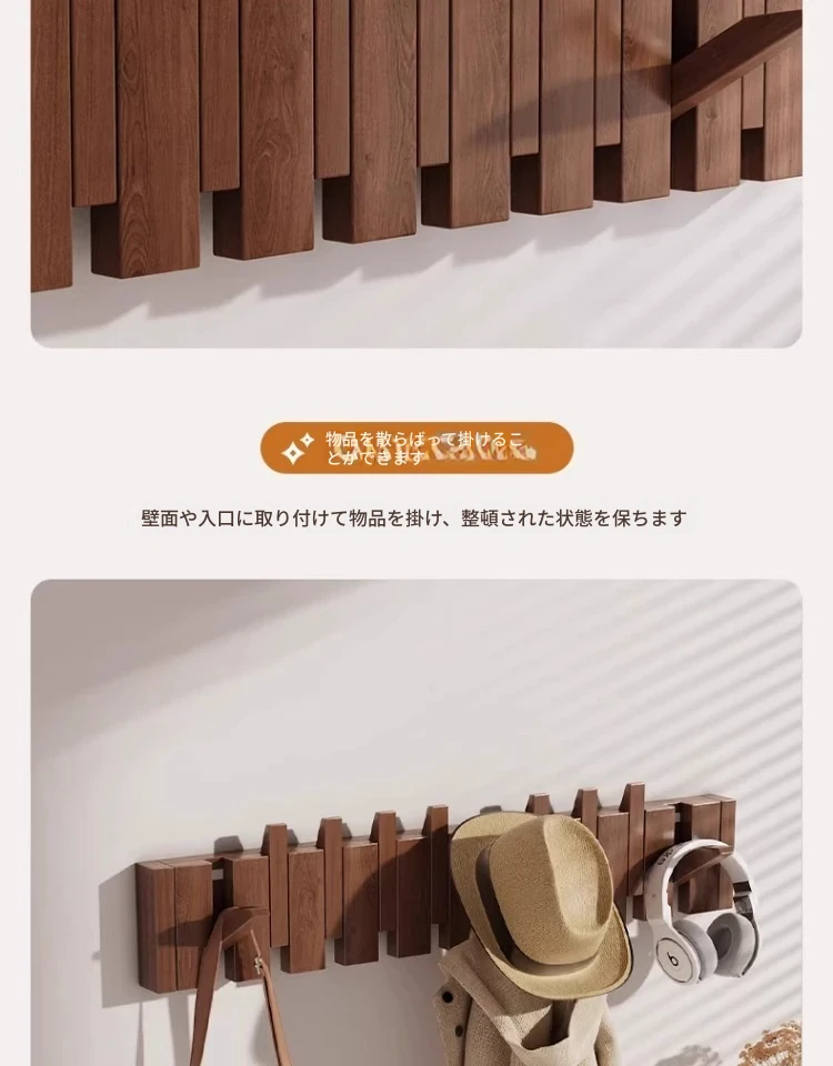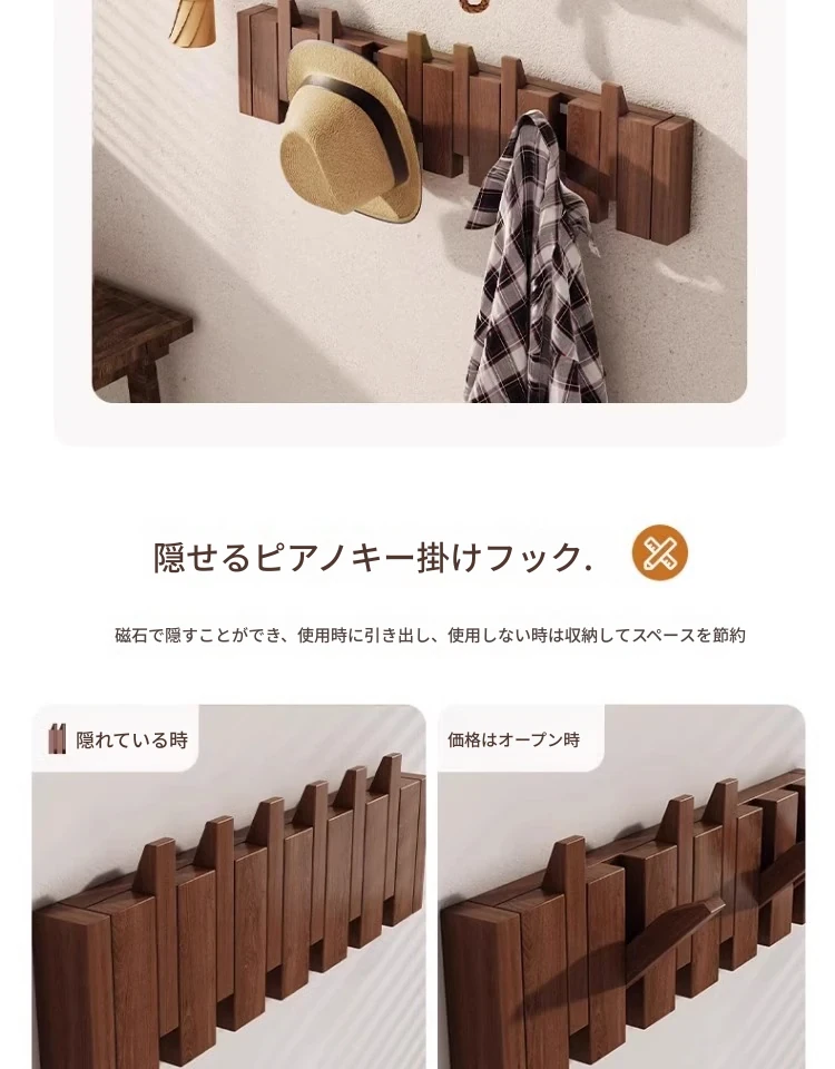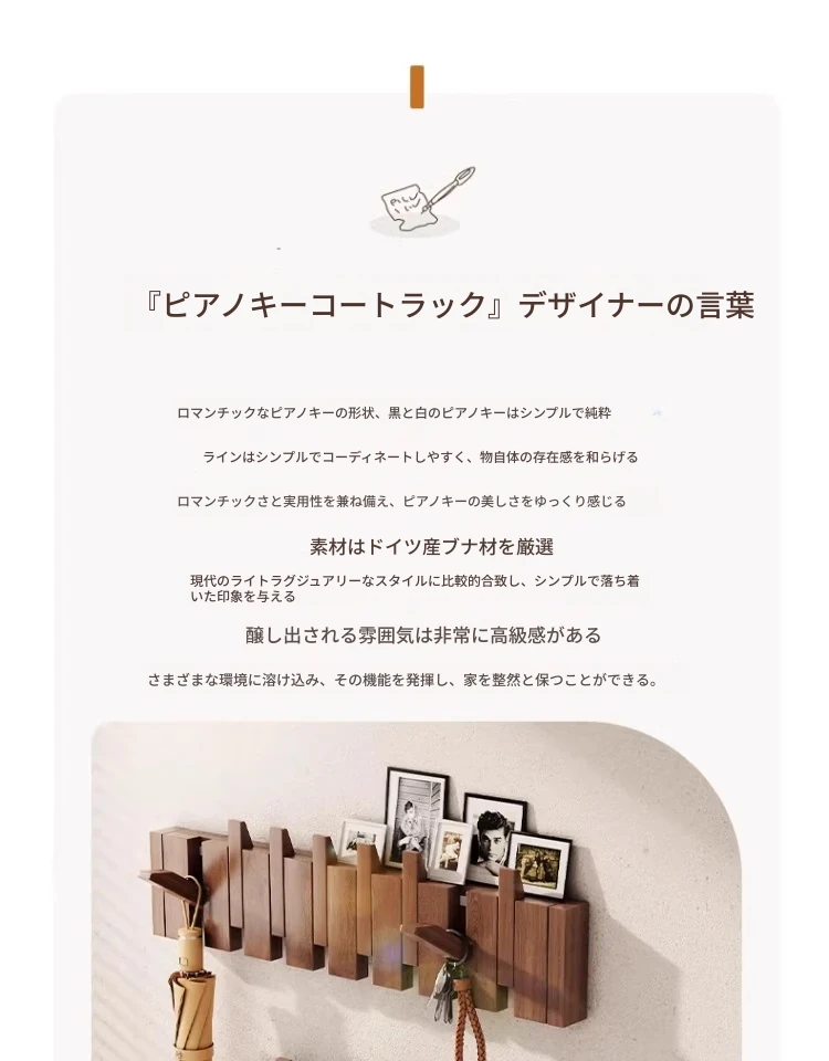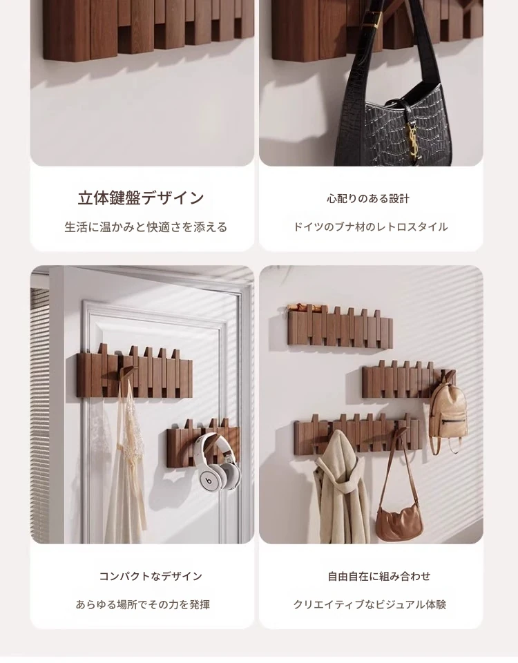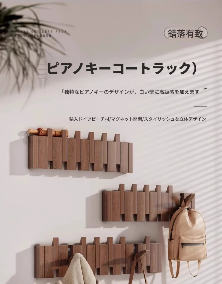 ピアノキー型の創造的な壁掛けコートハンガー - 穴を開けずに取り付け可能!天然木製、玄関や寝室のドア裏に最適な収納ソリューションです。おしゃれで実用的な衣類・帽子ラックで、空間を美しく演出します。