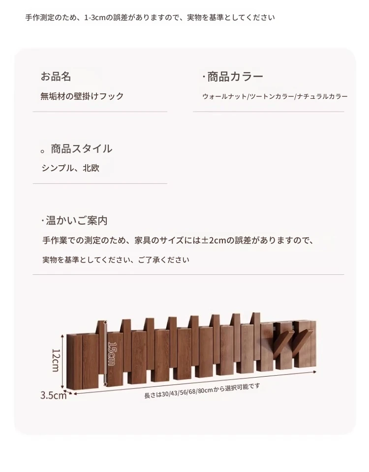 ナチュラル色12フック【輸入ブナ材 強化太型】