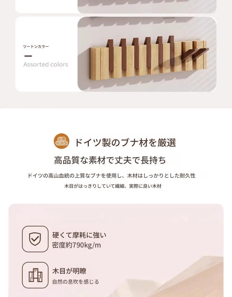 ナチュラル色8フック【輸入ブナ材 強化太型】