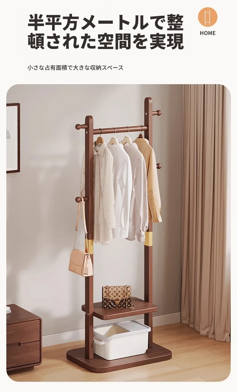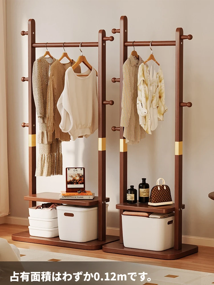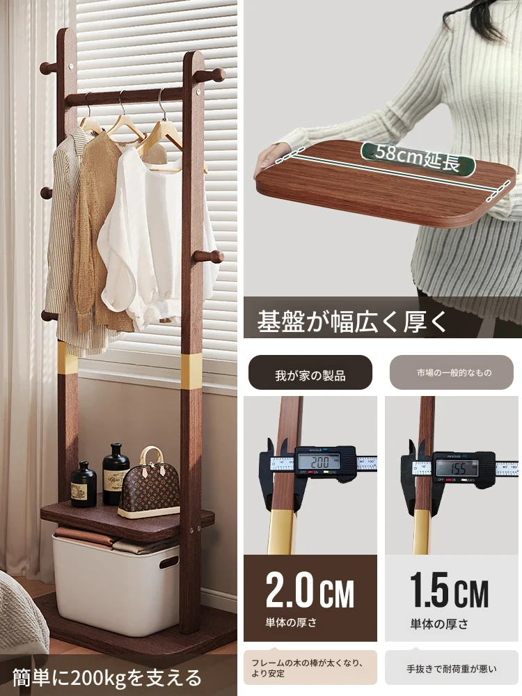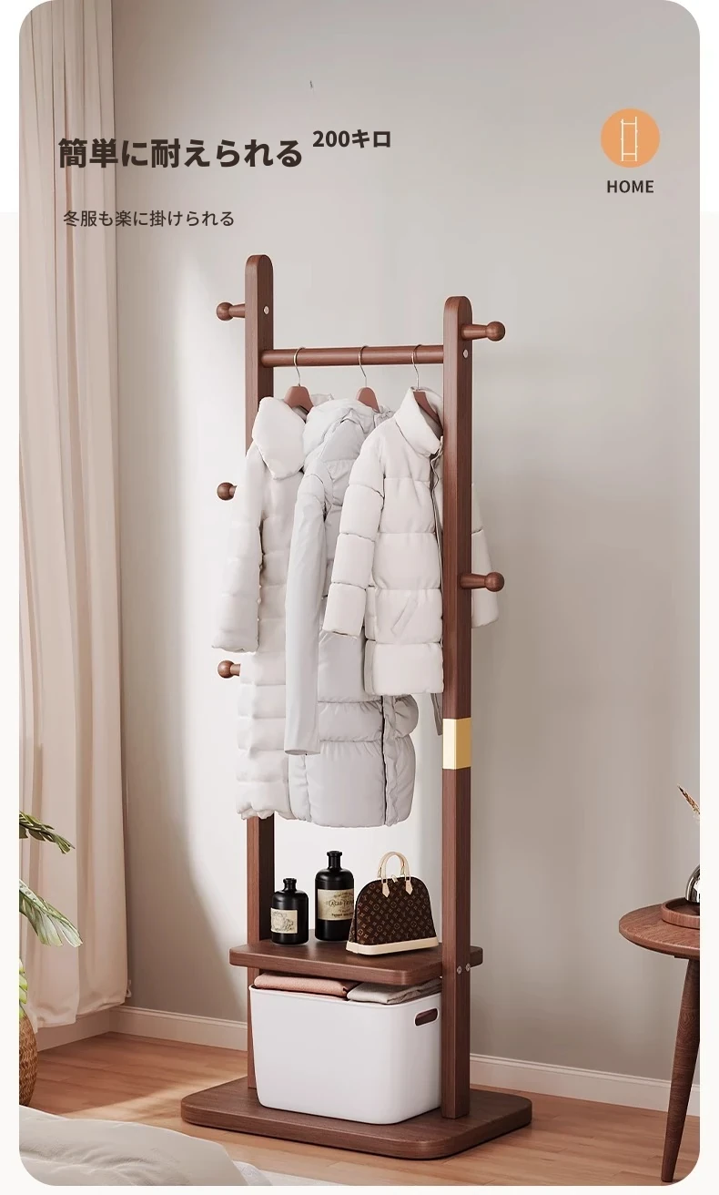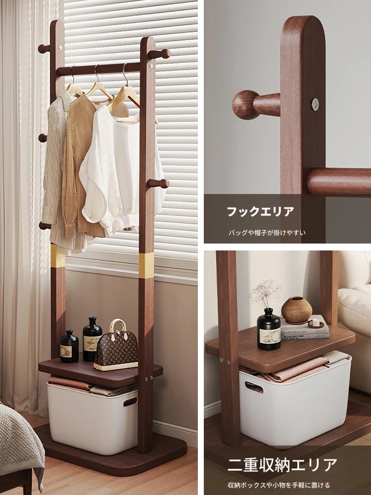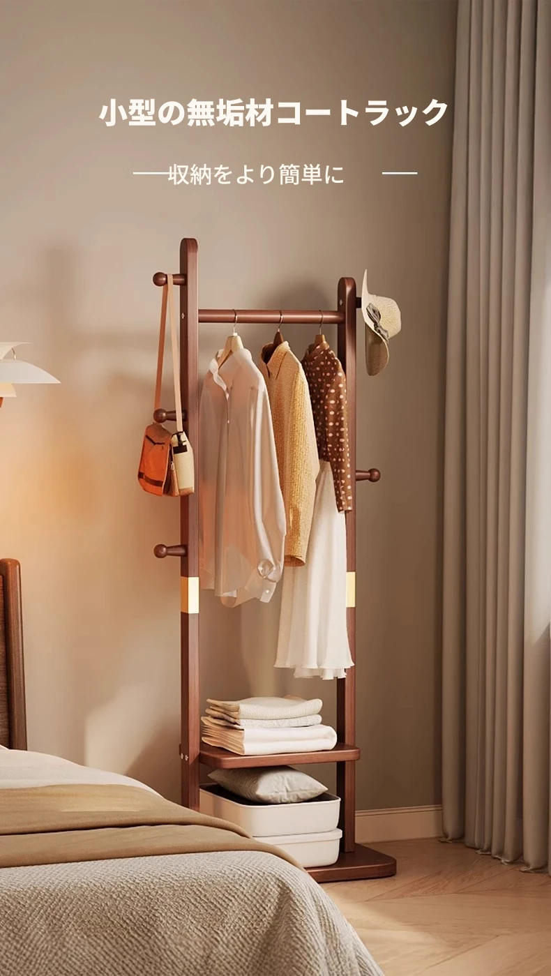 二重構造のスタンド式木製コートハンガー!寝室やリビング、玄関にぴったりの多機能衣類収納ラック。おしゃれで実用的、角にぴったりフィットしてスペースを有効活用!