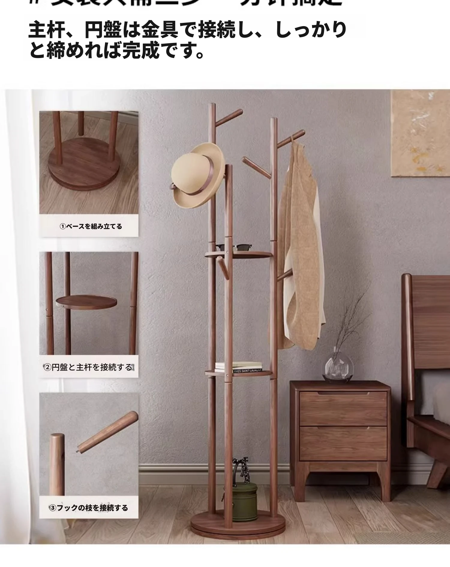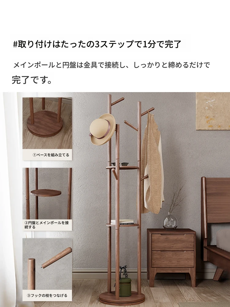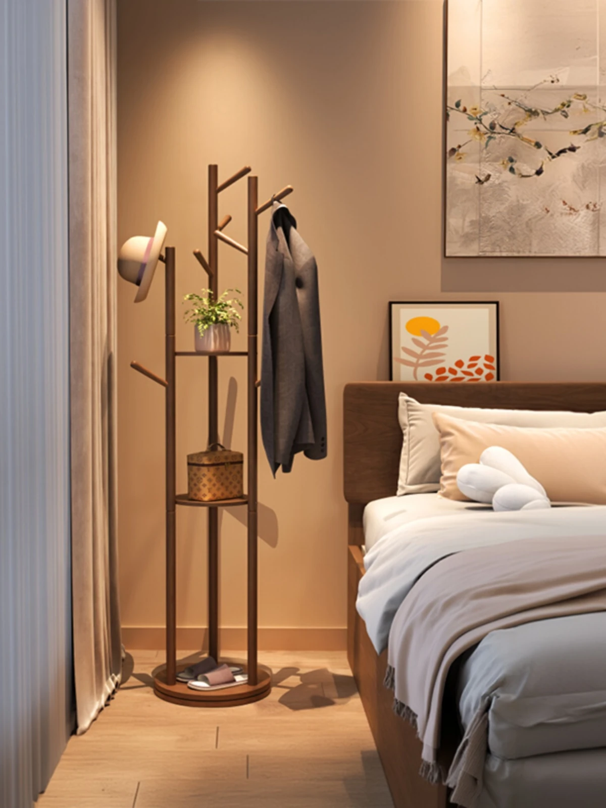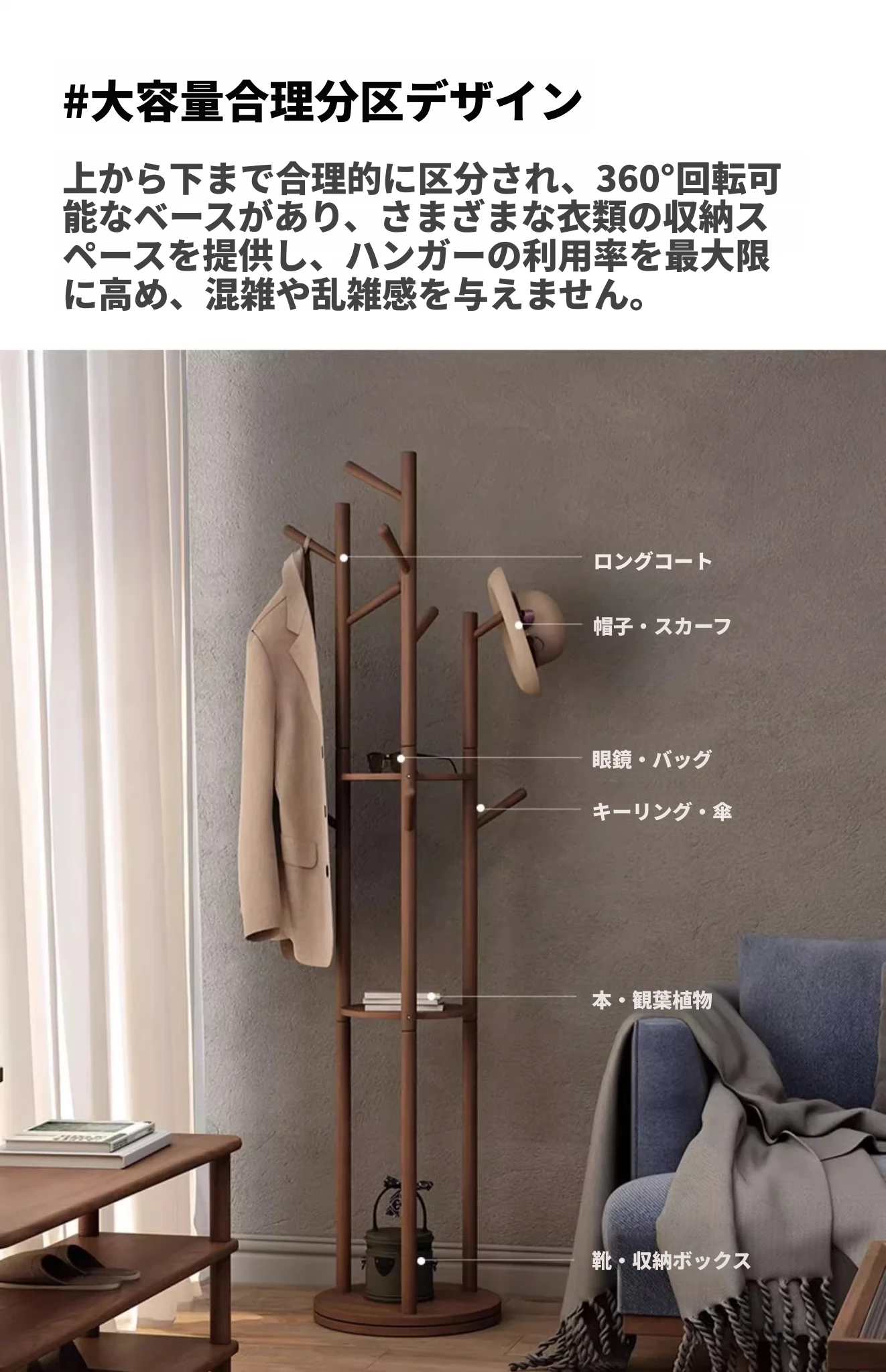 天然木製のスタンド型コートハンガー - おしゃれで機能的な衣類収納、寝室やリビングにぴったり!軽やかなデザインで、あなたの空間をスタイリッシュに演出します。