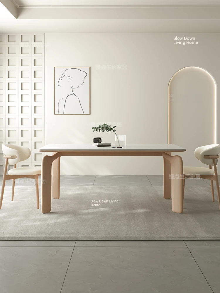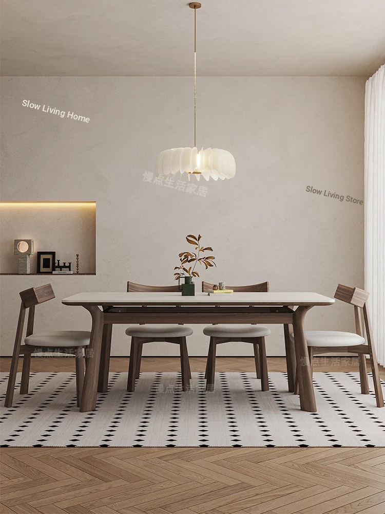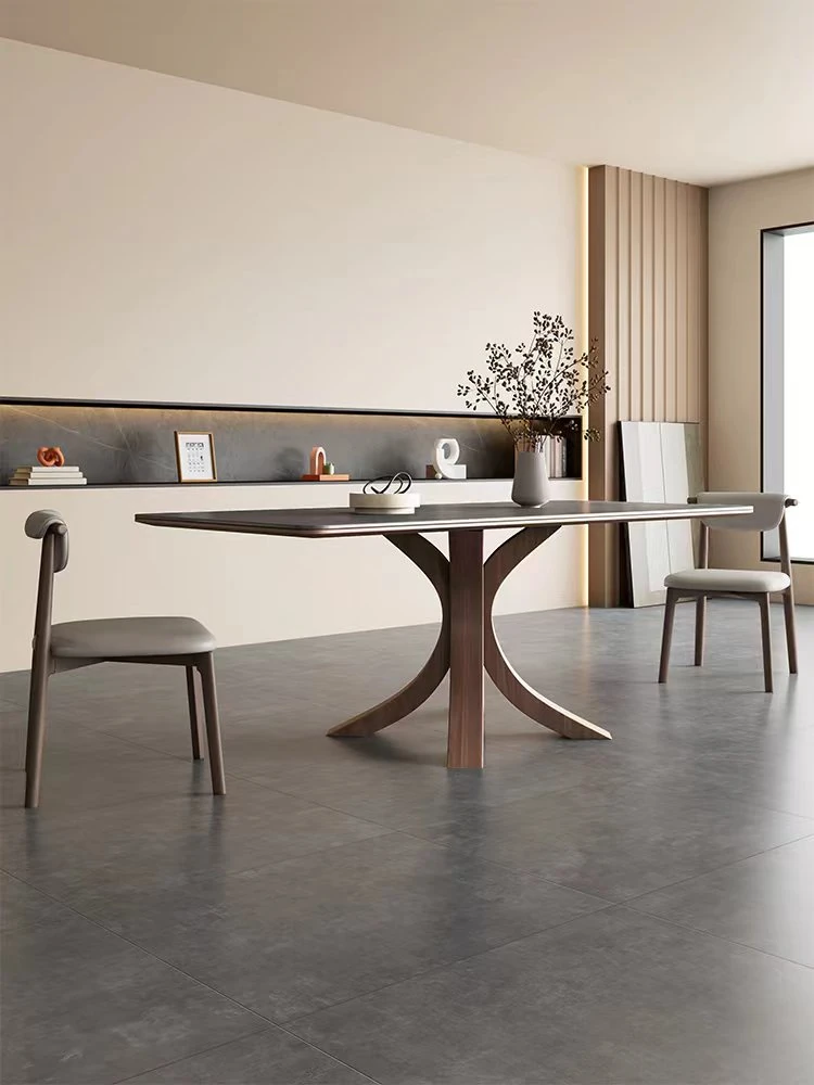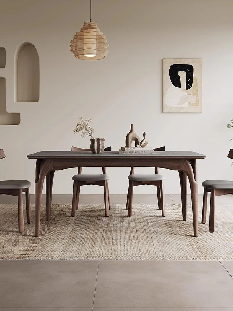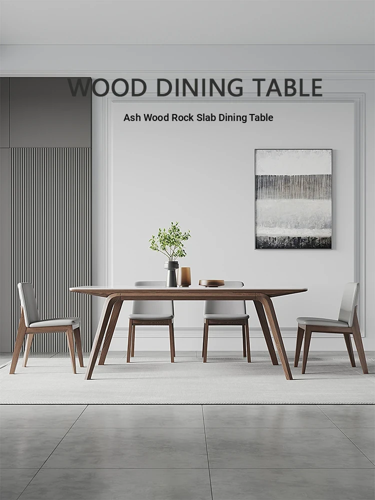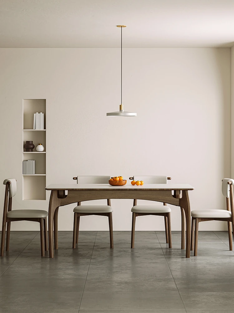 Nordic Solid Wood Rectangular Dining Table - Modern Minimalist Light Luxury with Walnut Finish and Matte Ash Wood, Featuring Elegant Stone Top for Home Use