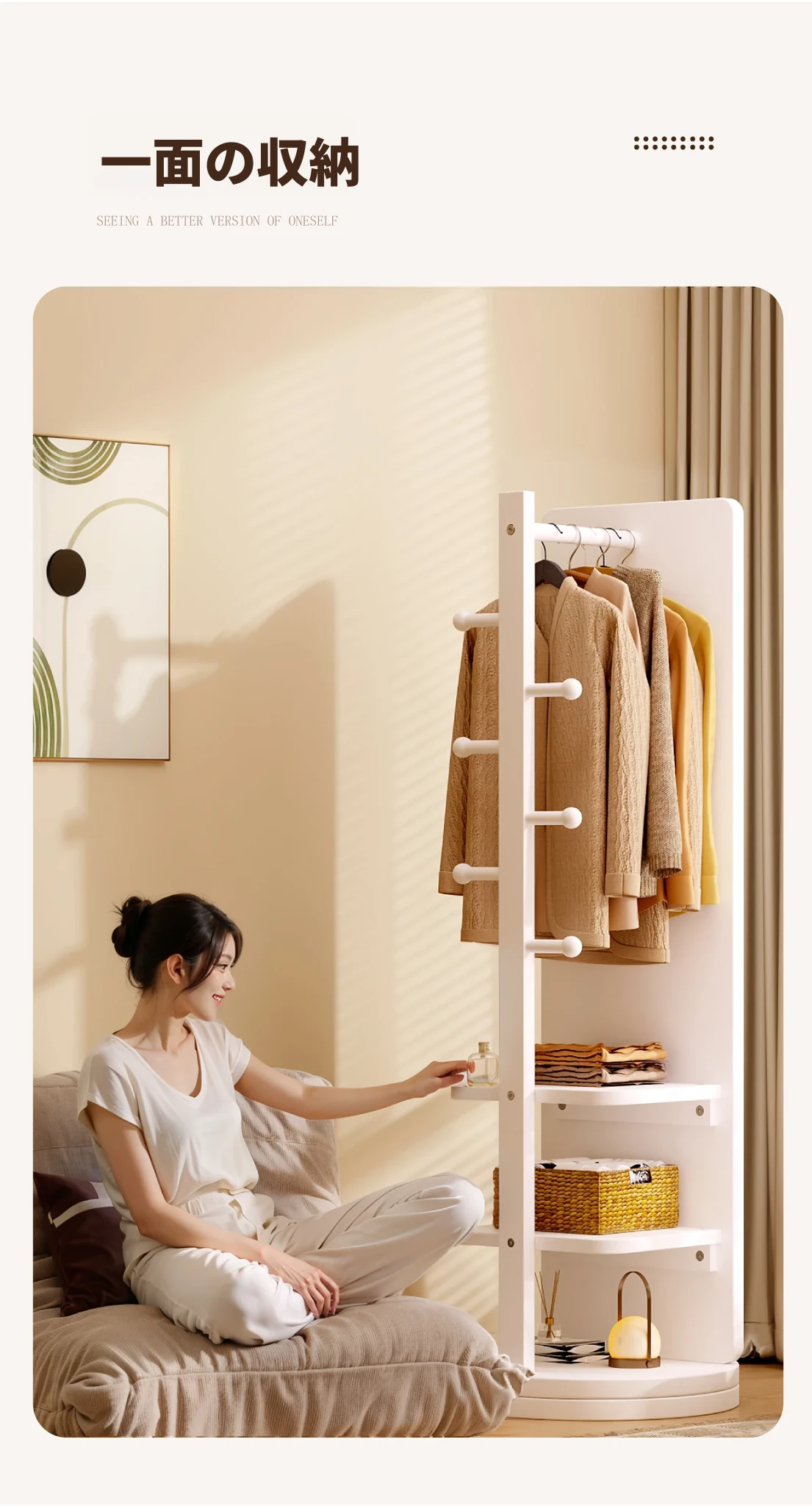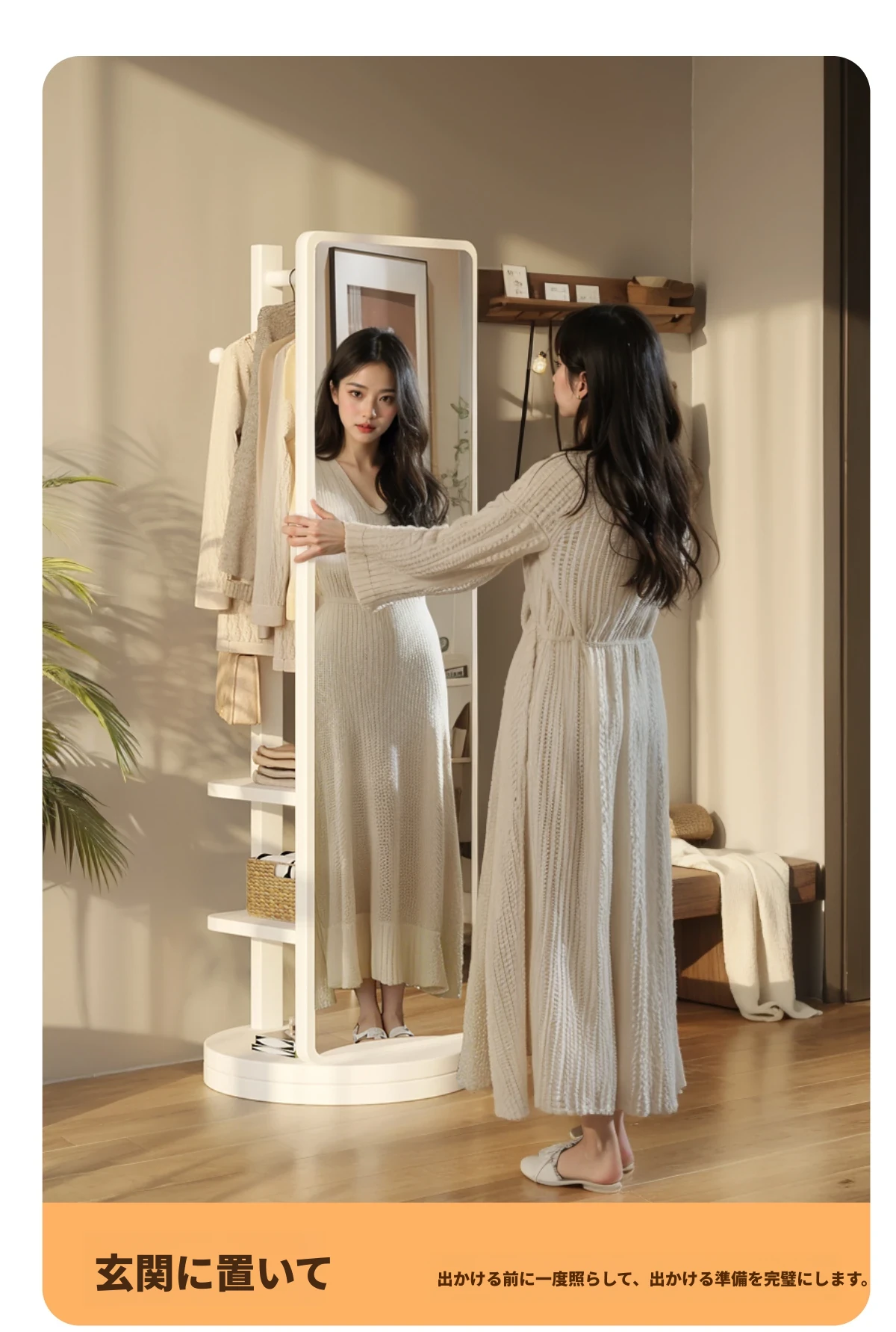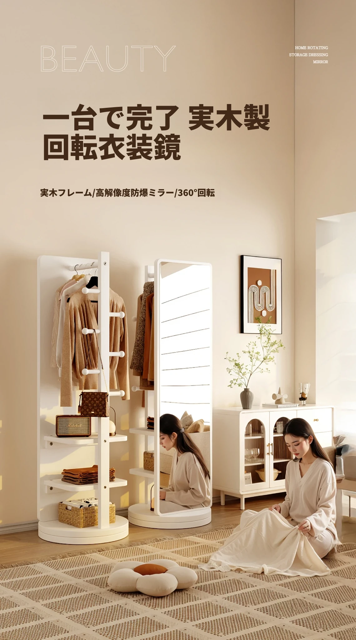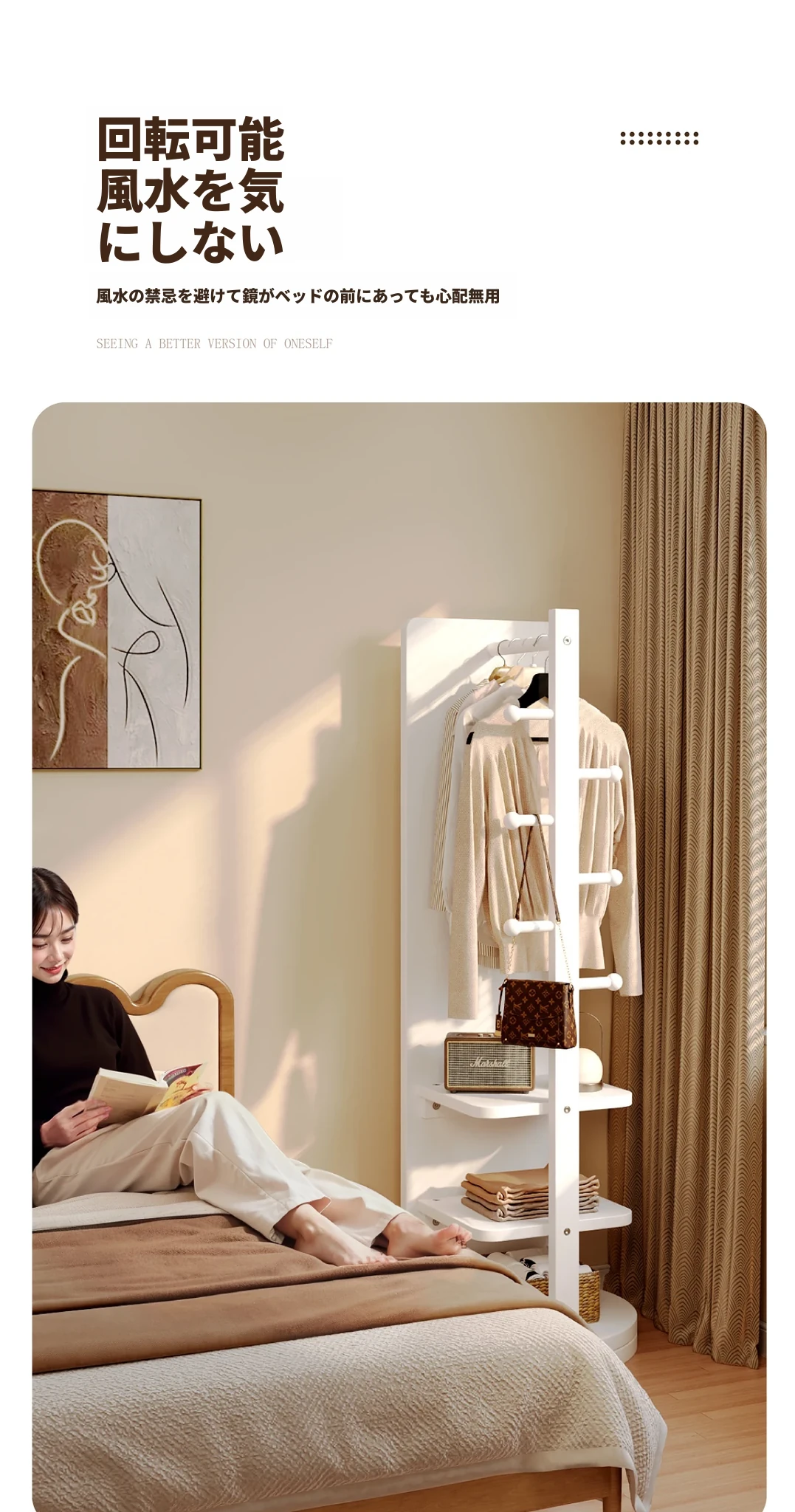 高品質の無垢材全身鏡!回転式で移動も簡単、衣類ハンガー付きの便利な試着ミラー。寝室やリビングにぴったり、スタイリッシュなデザインでおしゃれを楽しもう!