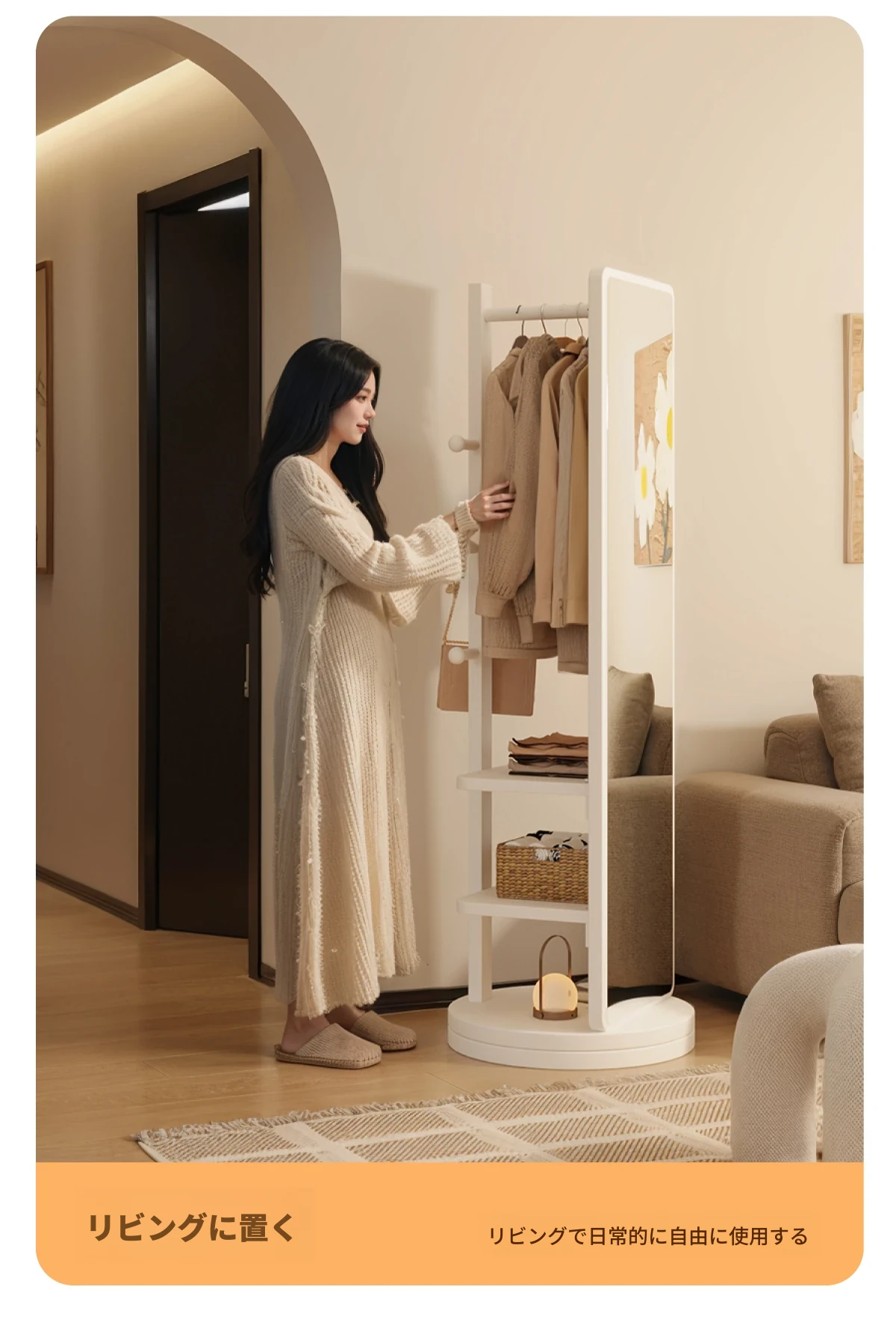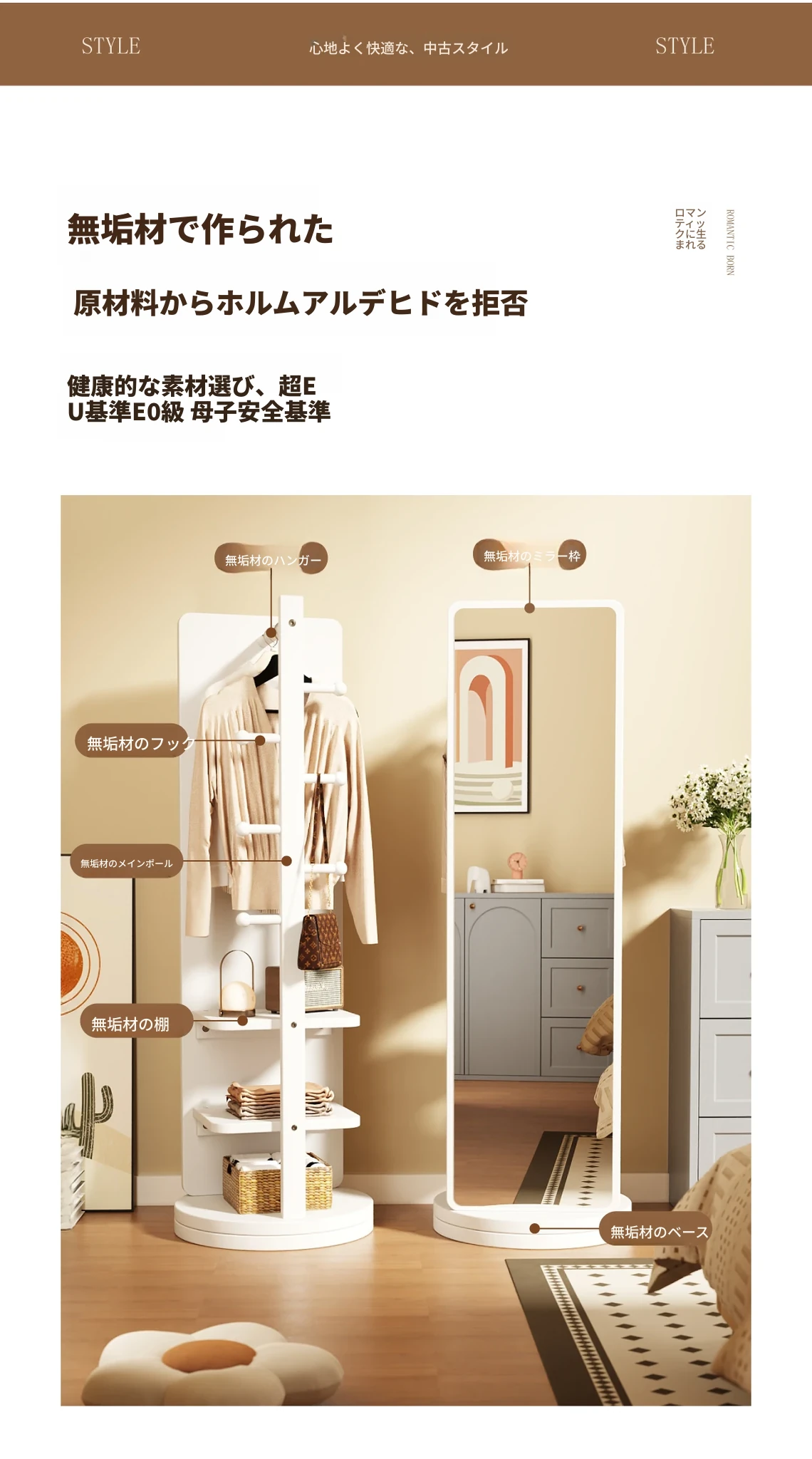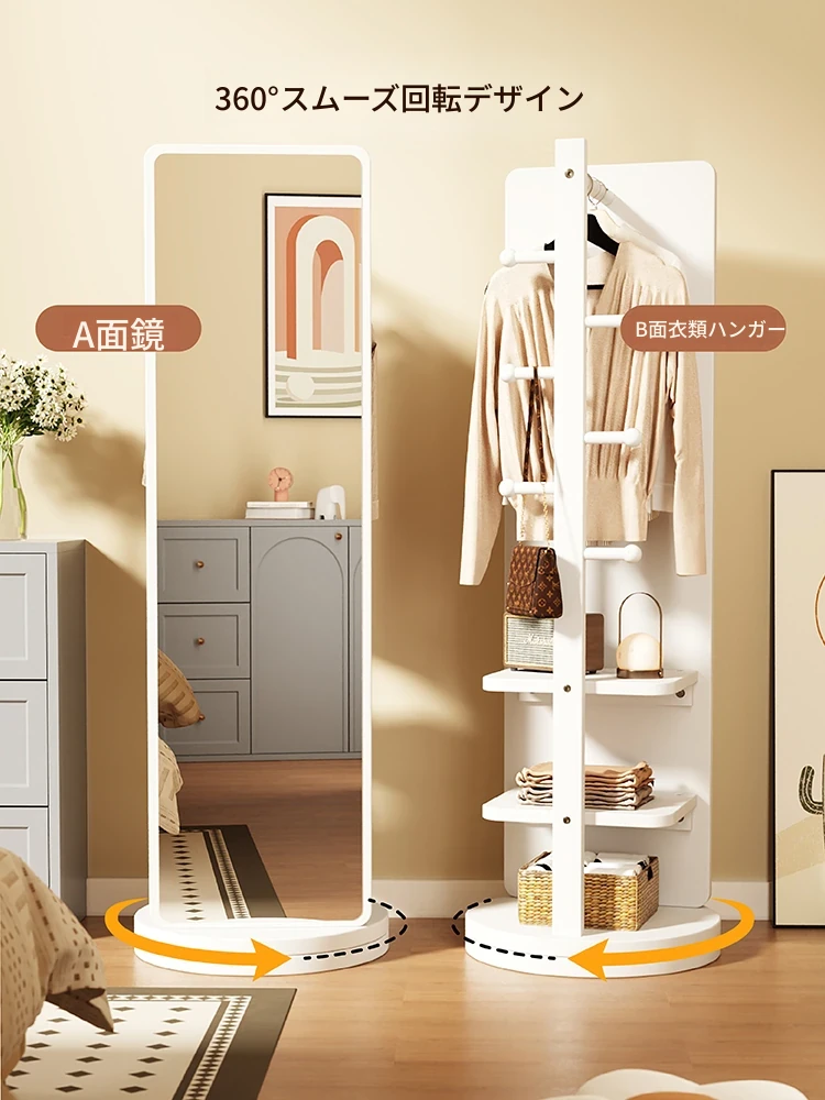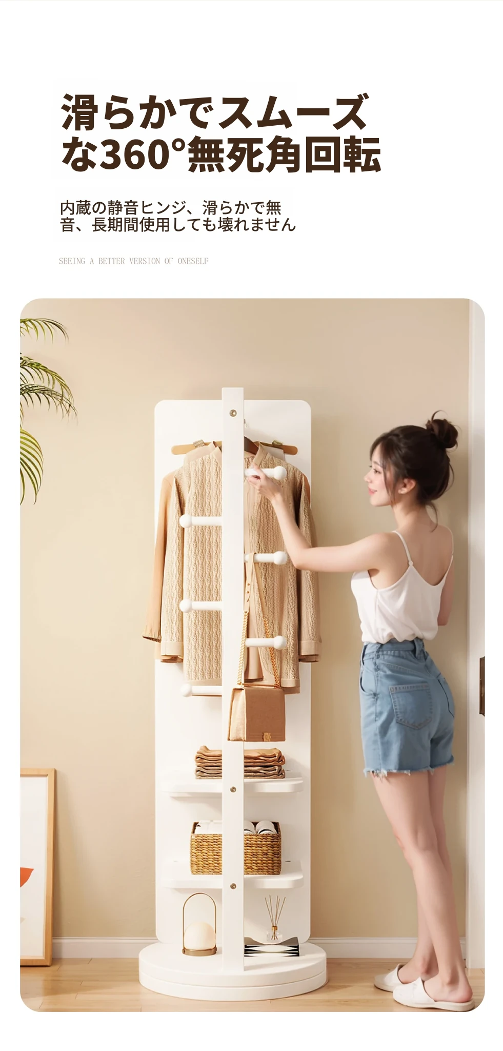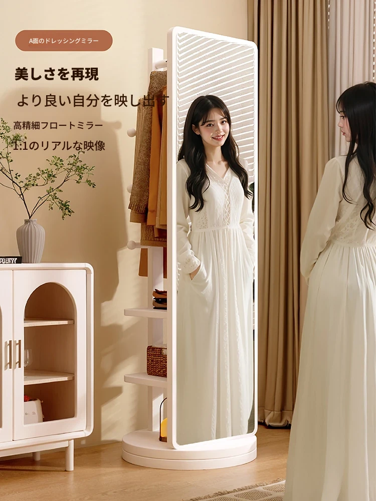 高品質の無垢材全身鏡!回転式で移動も簡単、衣類ハンガー付きの便利な試着ミラー。寝室やリビングにぴったり、スタイリッシュなデザインでおしゃれを楽しもう!