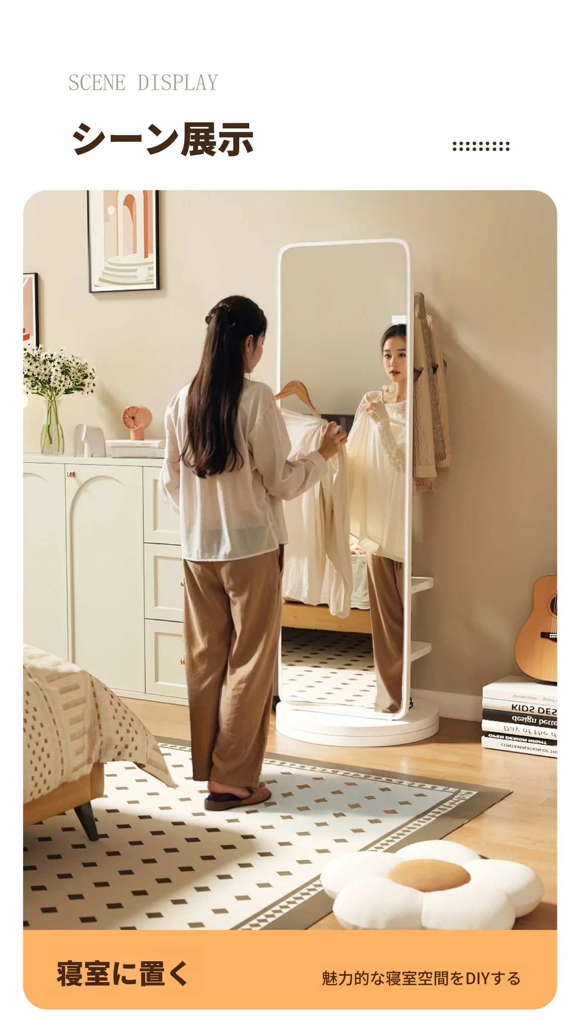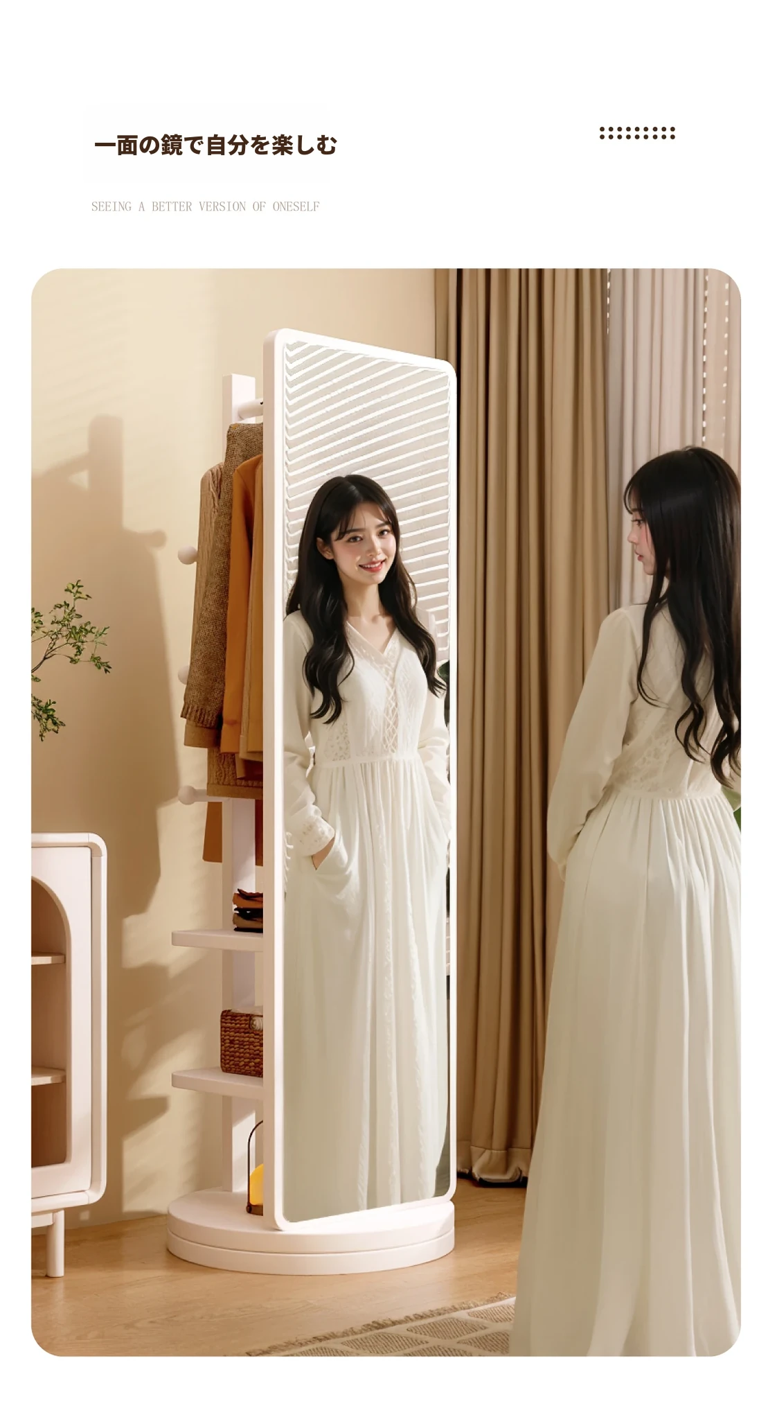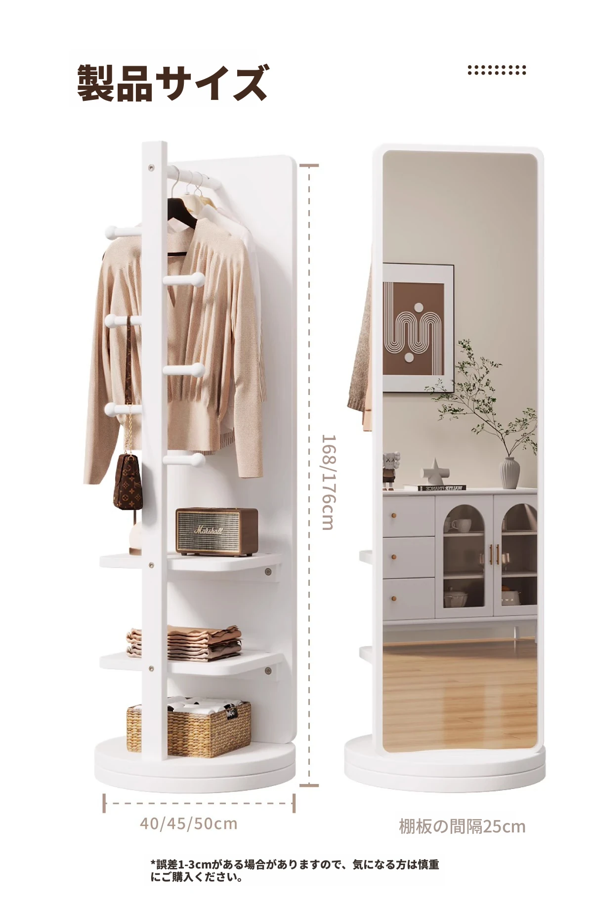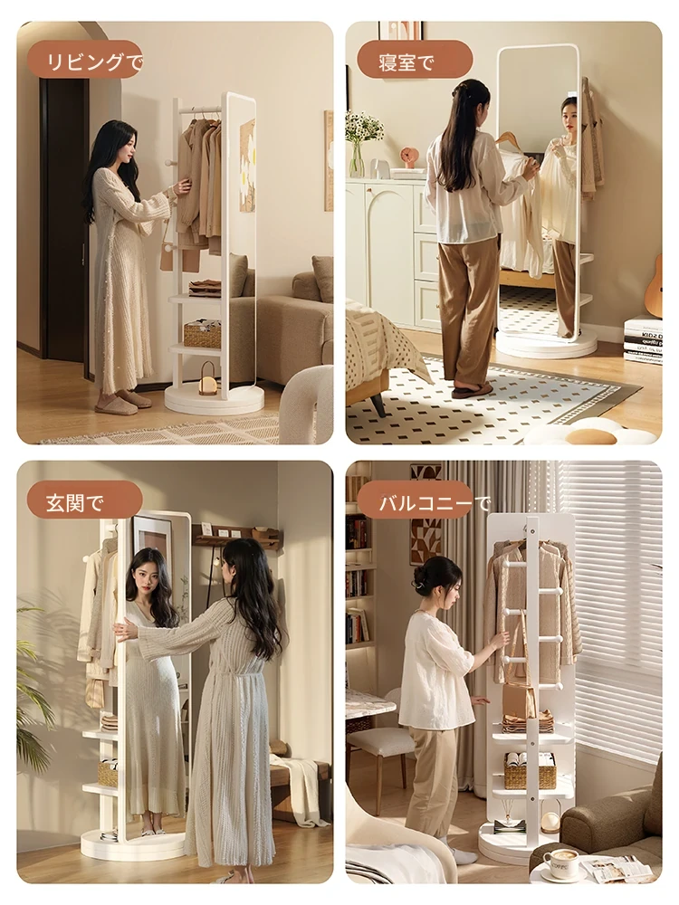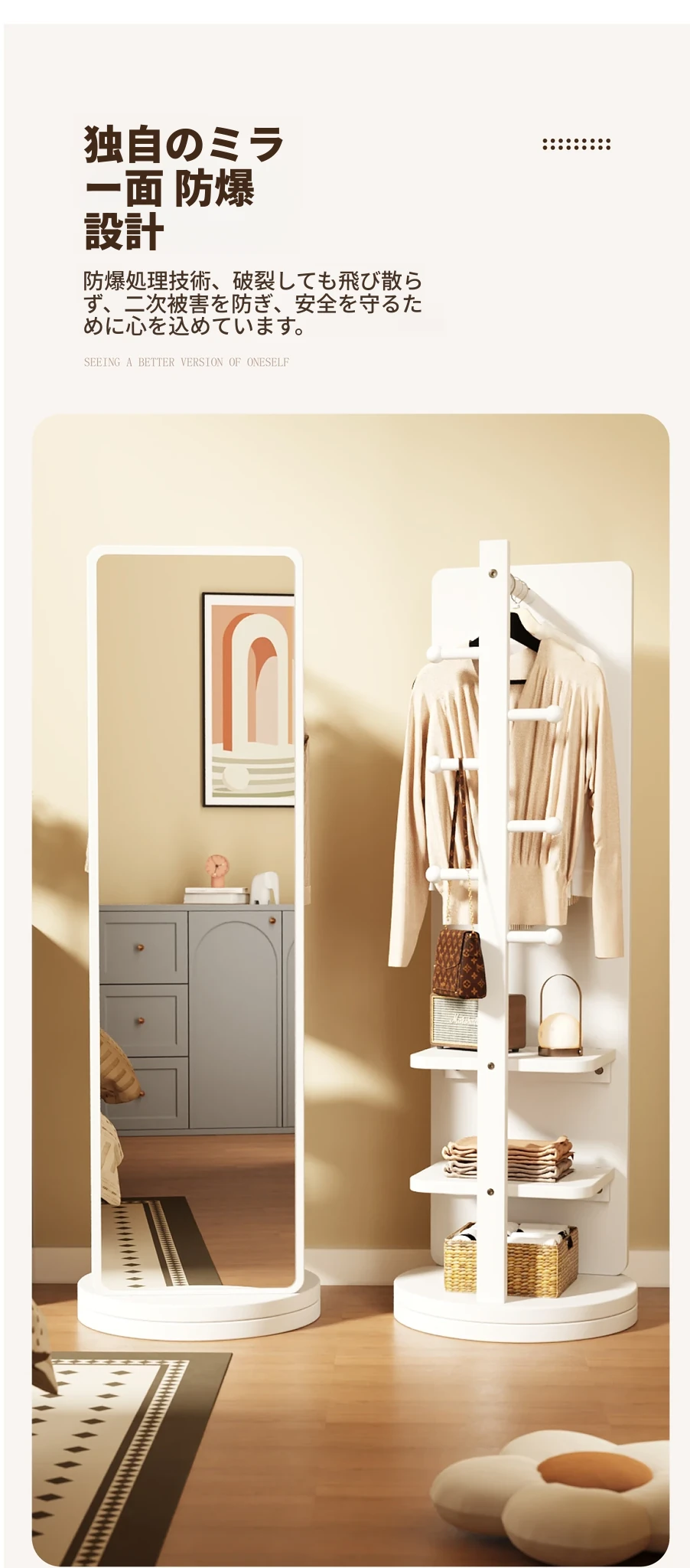 高品質の無垢材全身鏡!回転式で移動も簡単、衣類ハンガー付きの便利な試着ミラー。寝室やリビングにぴったり、スタイリッシュなデザインでおしゃれを楽しもう!