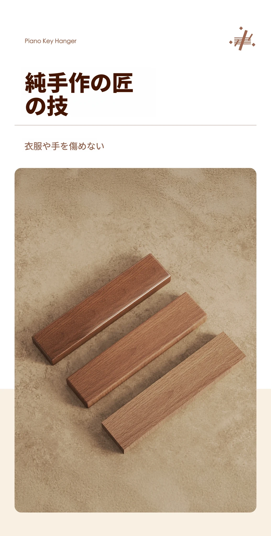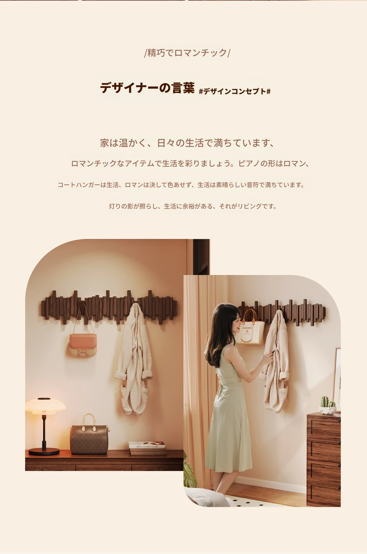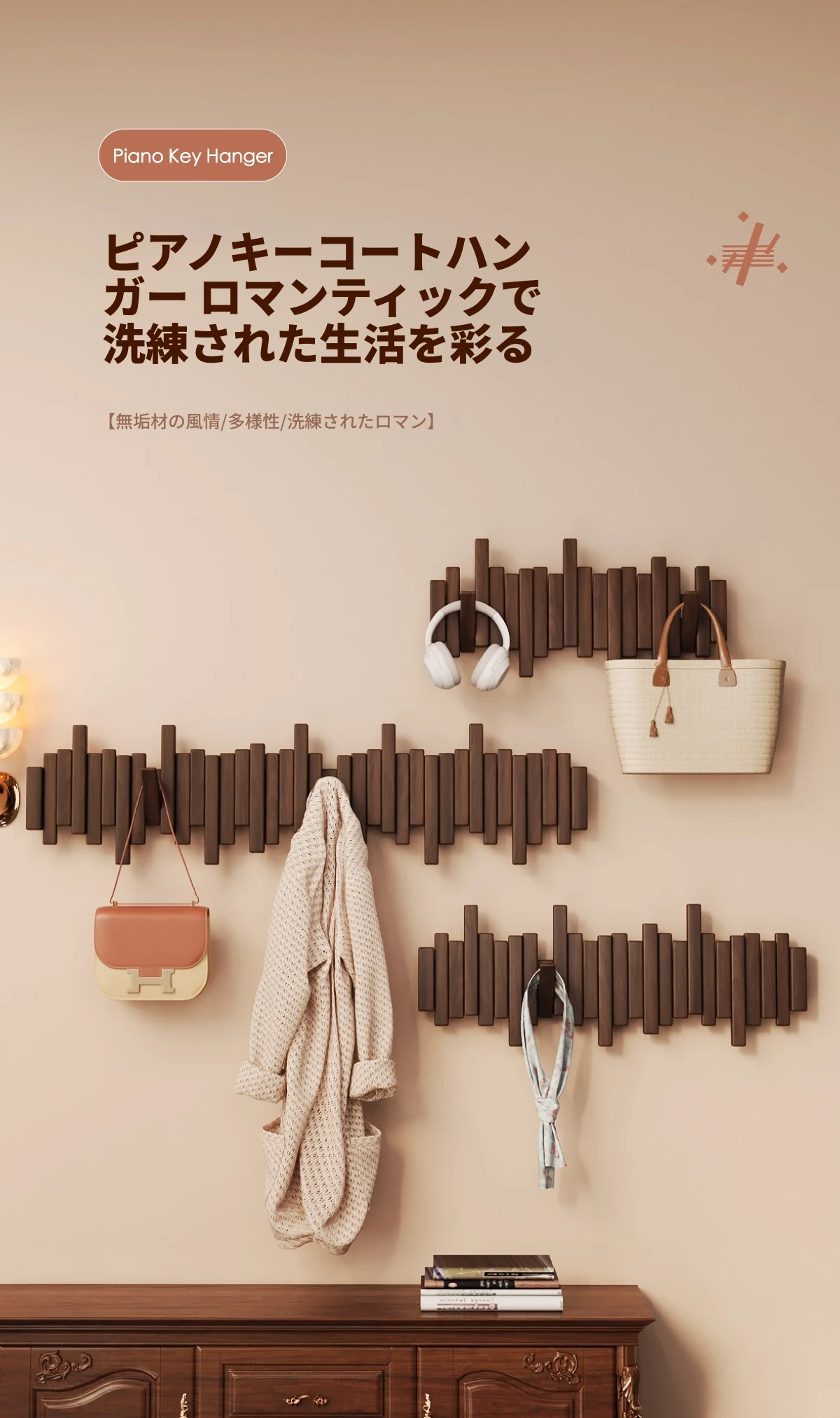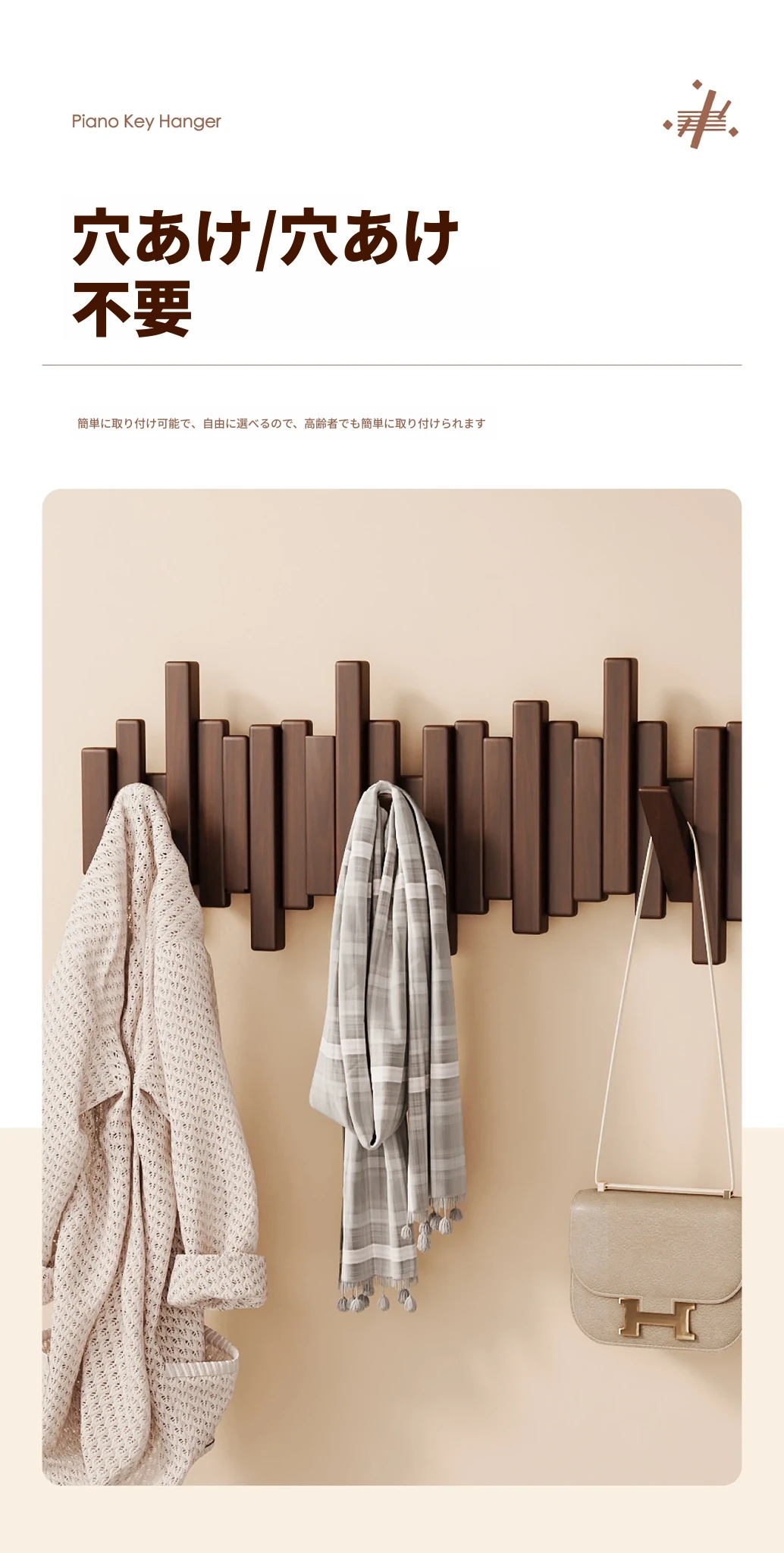 天然木製ピアノキーのコートハンガー - 玄関や壁にぴったりなノー打孔デザイン!おしゃれな衣類・帽子掛け、寝室にも最適な収納ソリューション。おしゃれで実用的、あなたの空間を彩ります!