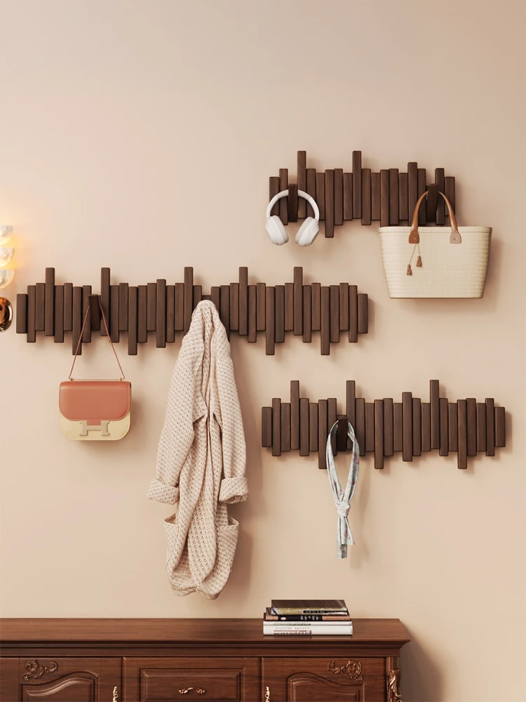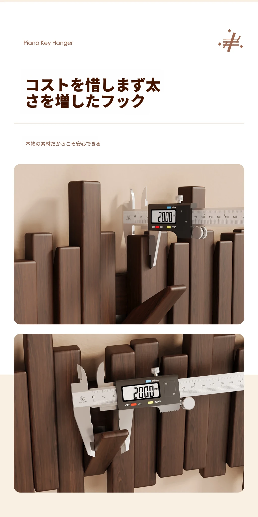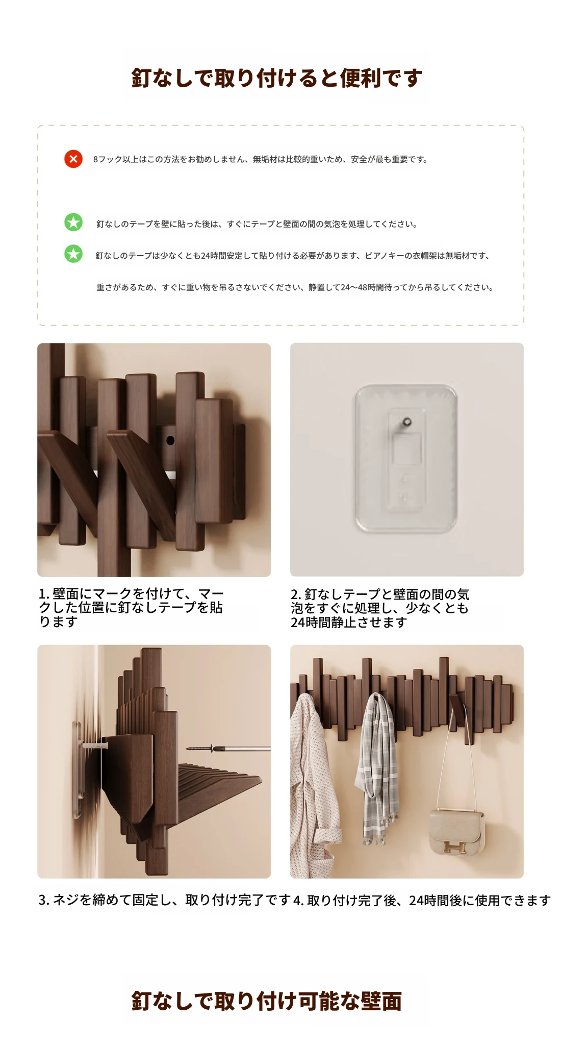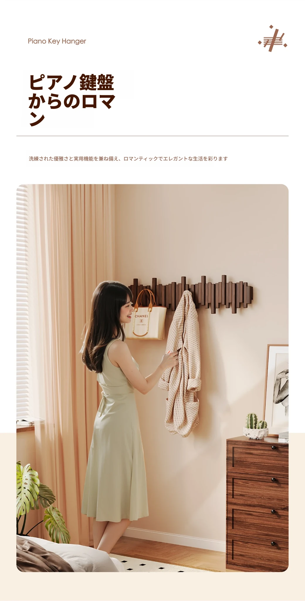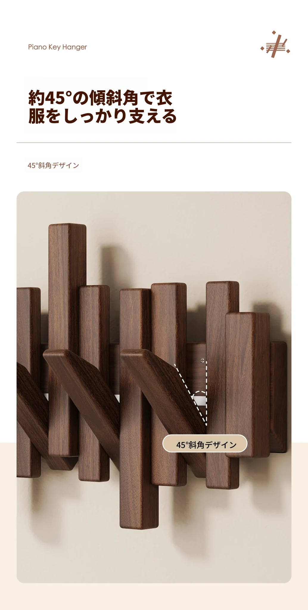 天然木製ピアノキーのコートハンガー - 玄関や壁にぴったりなノー打孔デザイン!おしゃれな衣類・帽子掛け、寝室にも最適な収納ソリューション。おしゃれで実用的、あなたの空間を彩ります!