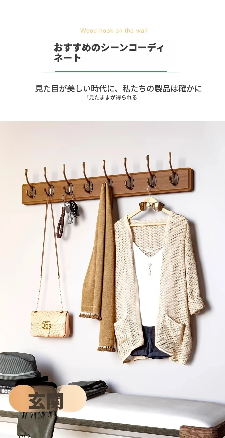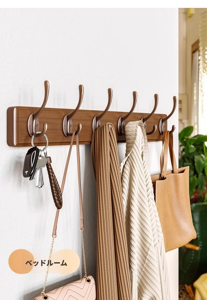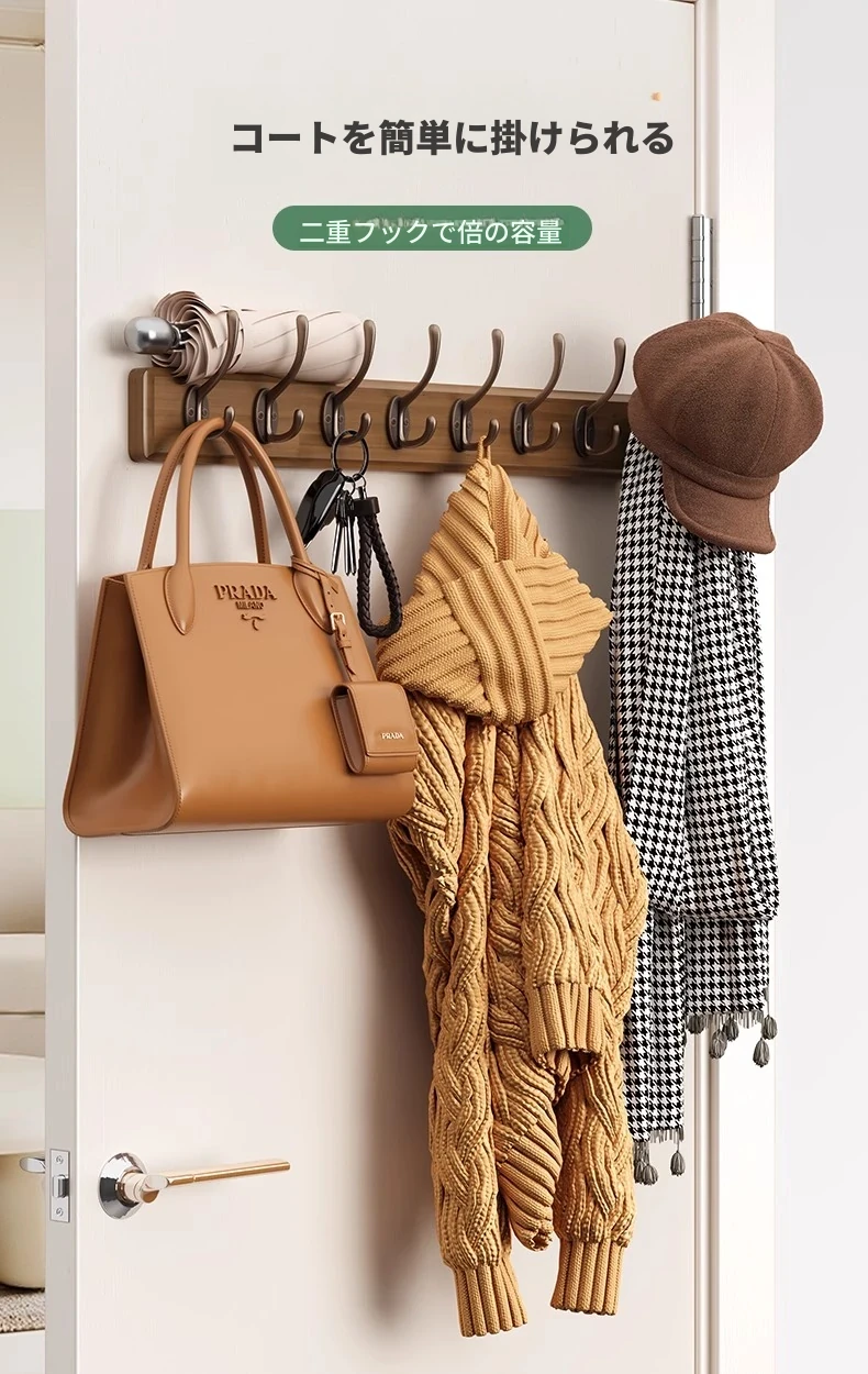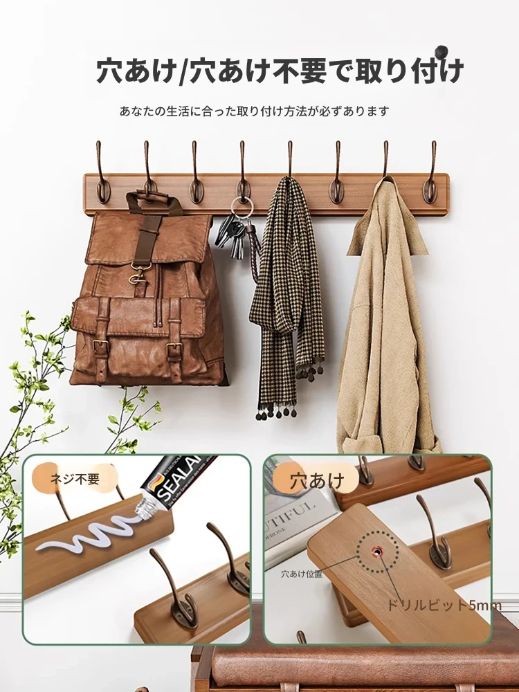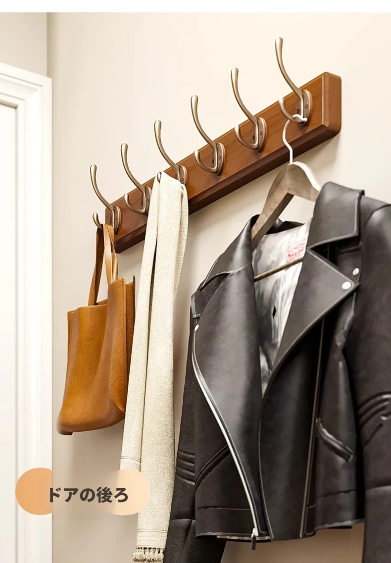 天然木製の壁掛けハンガー - 玄関や入口に最適!ドアの裏に取り付けるだけで簡単!穴あけ不要、鍵やコートを美しく収納。おしゃれで実用的な収納アイテムをお見逃しなく!
