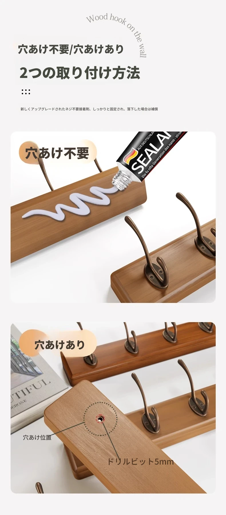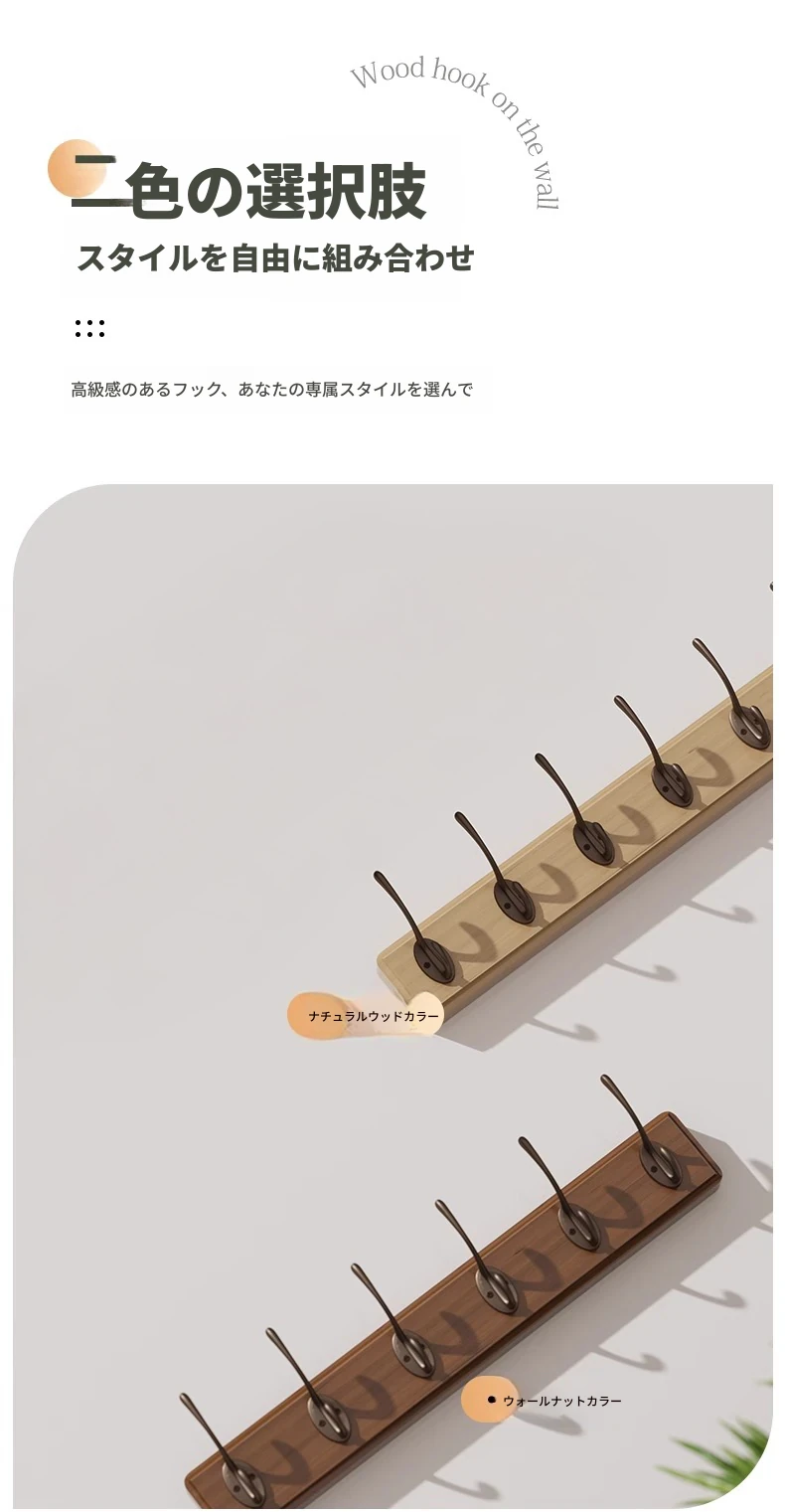 ナチュラルウッド色【5フック】頑丈な耐荷重 落下時保障❤️無垢材+環境に優しい無臭塗料