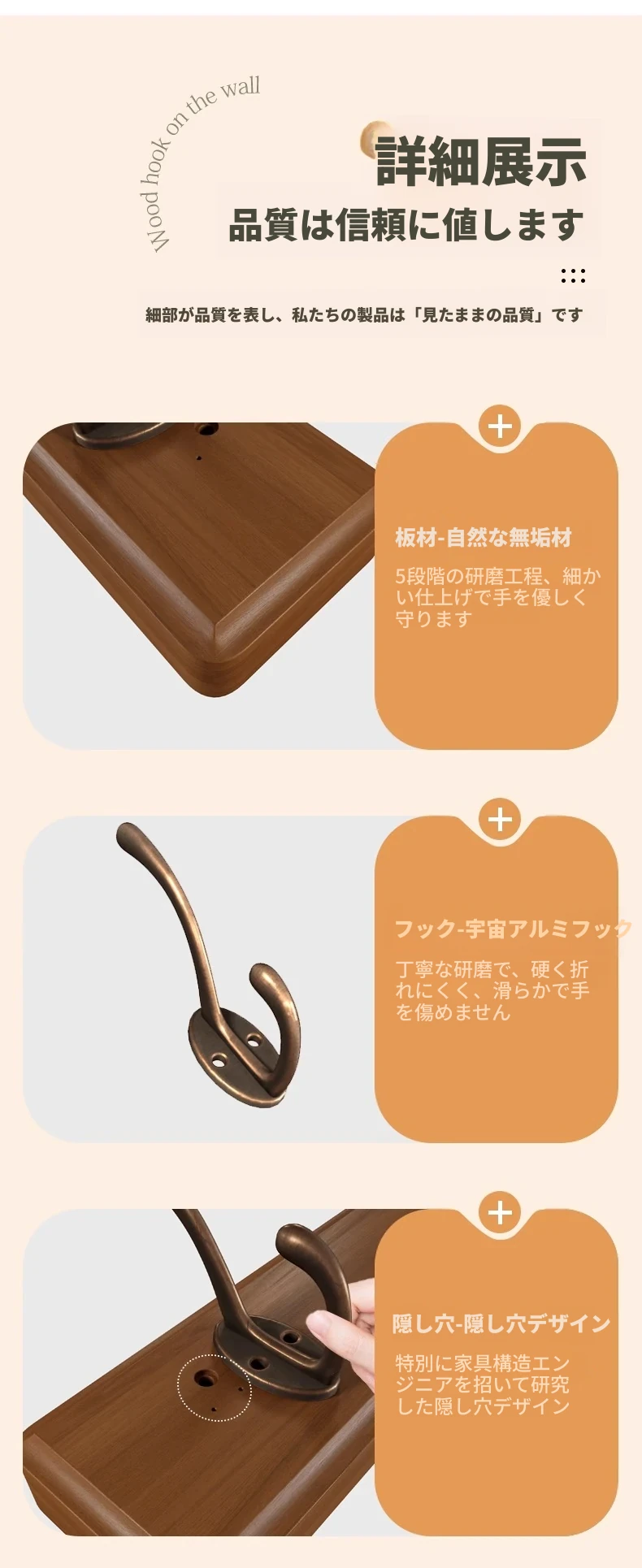 ナチュラルウッド色【4フック】頑丈な耐荷重 落下時保障❤️無垢材+環境に優しい無臭塗料