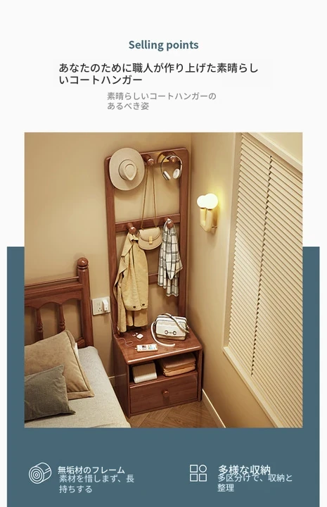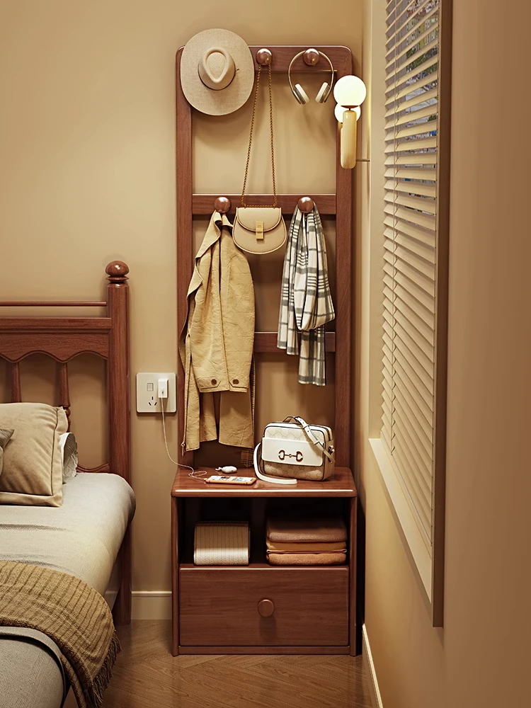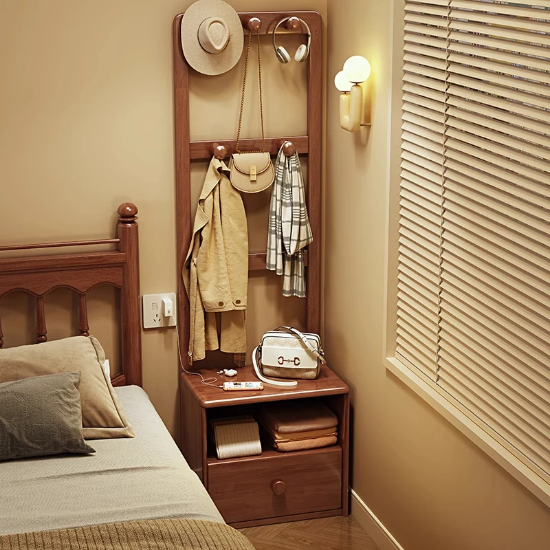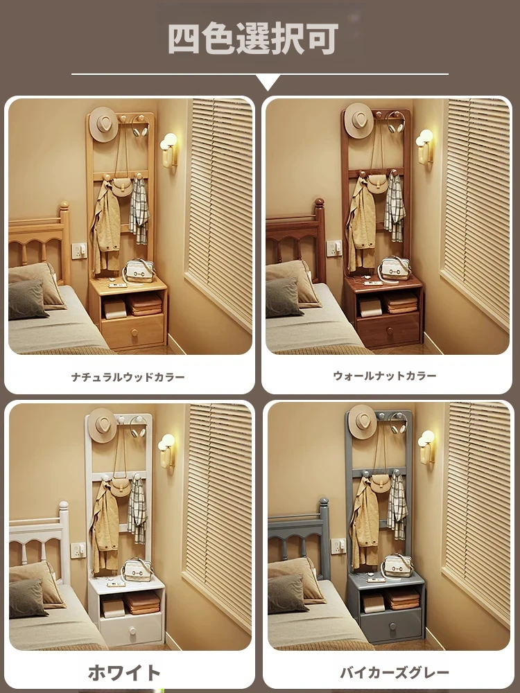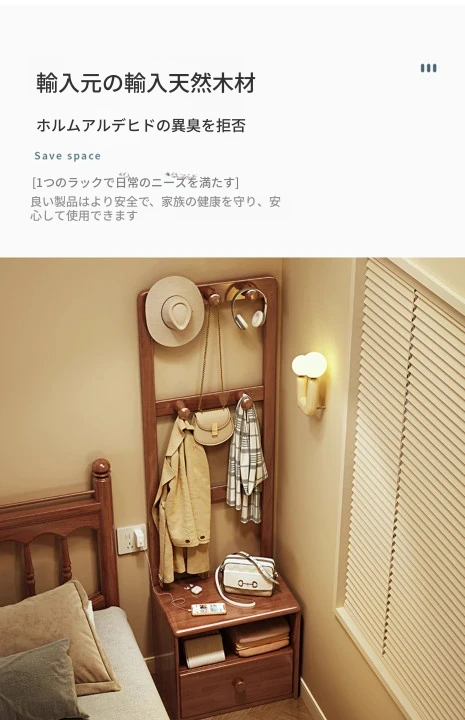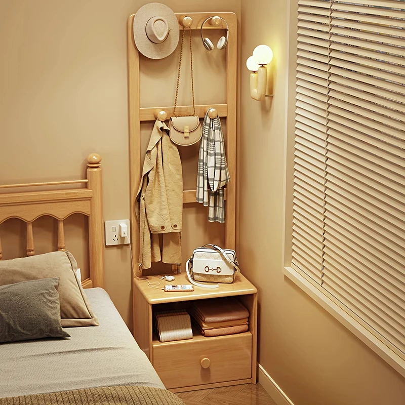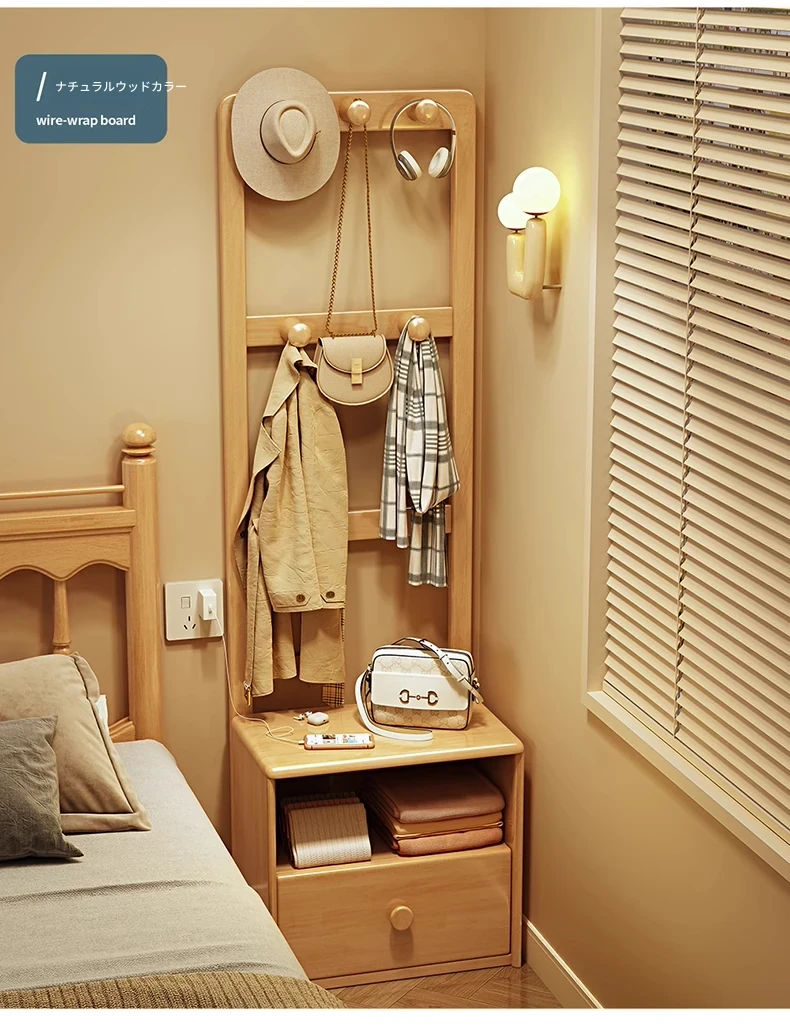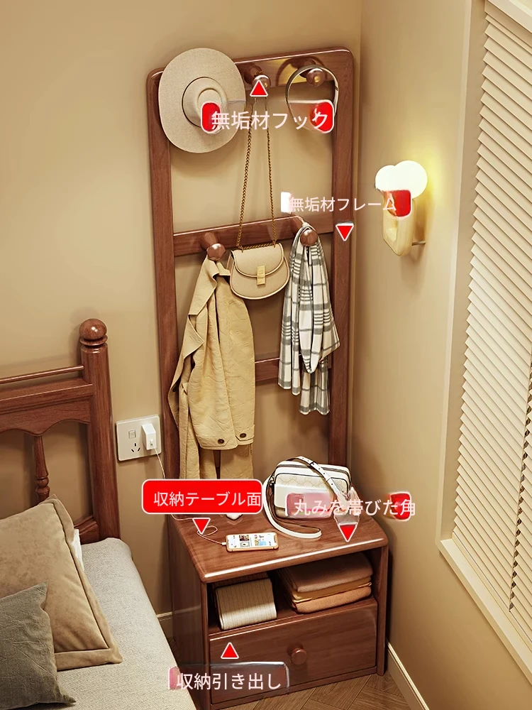 シンプルな無垢材のベッドサイドキャビネット&コートラック一体型!小さな部屋に最適な収納力を備えた、スタイリッシュな寝室用置物ラック。衣類や小物をすっきり整理して、快適な空間を実現!