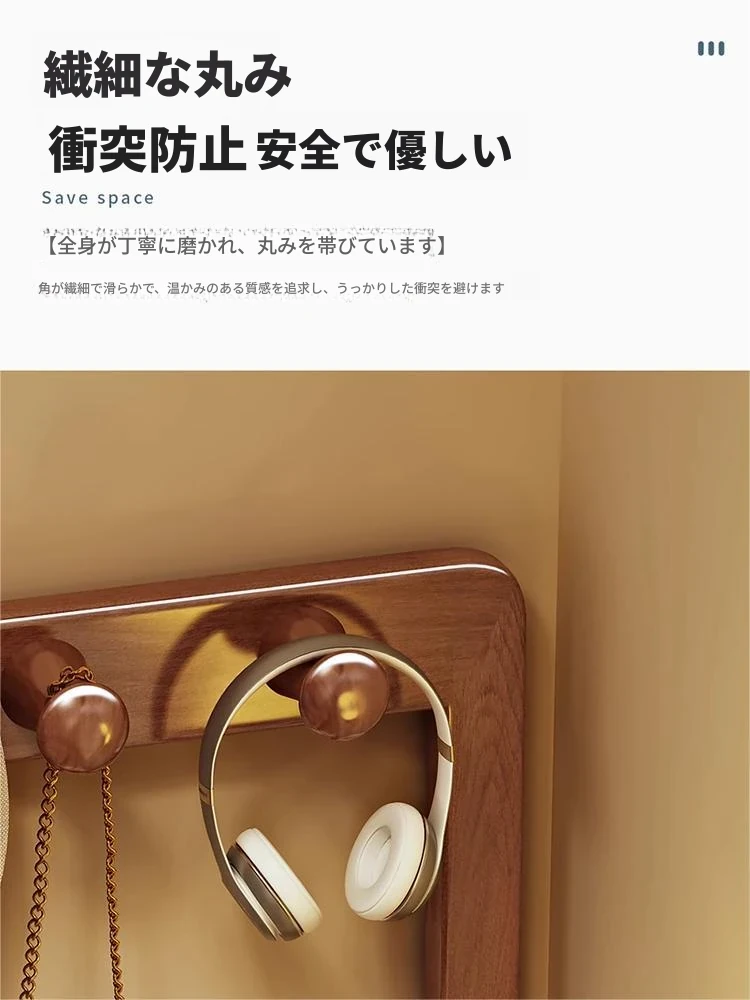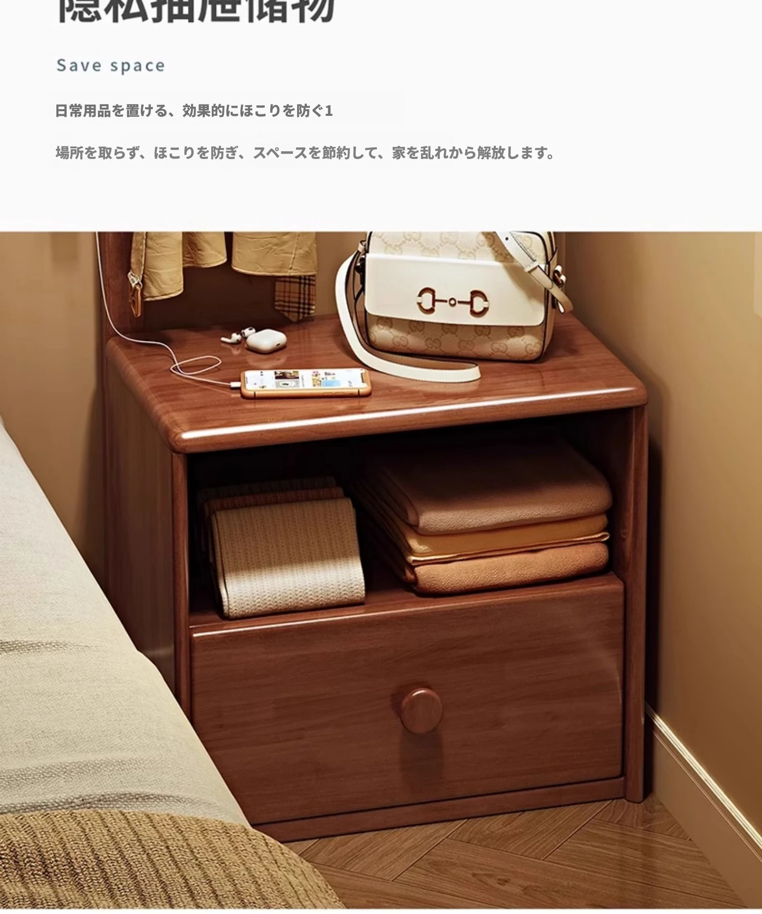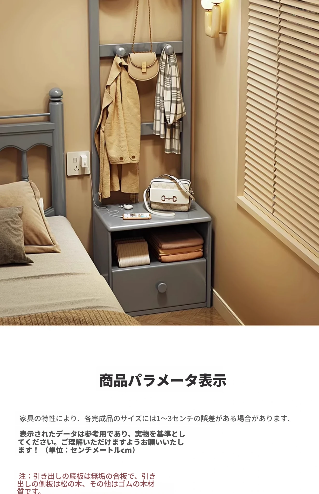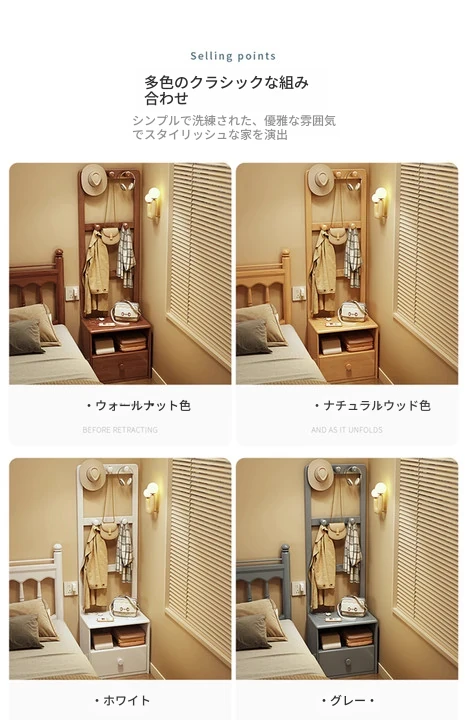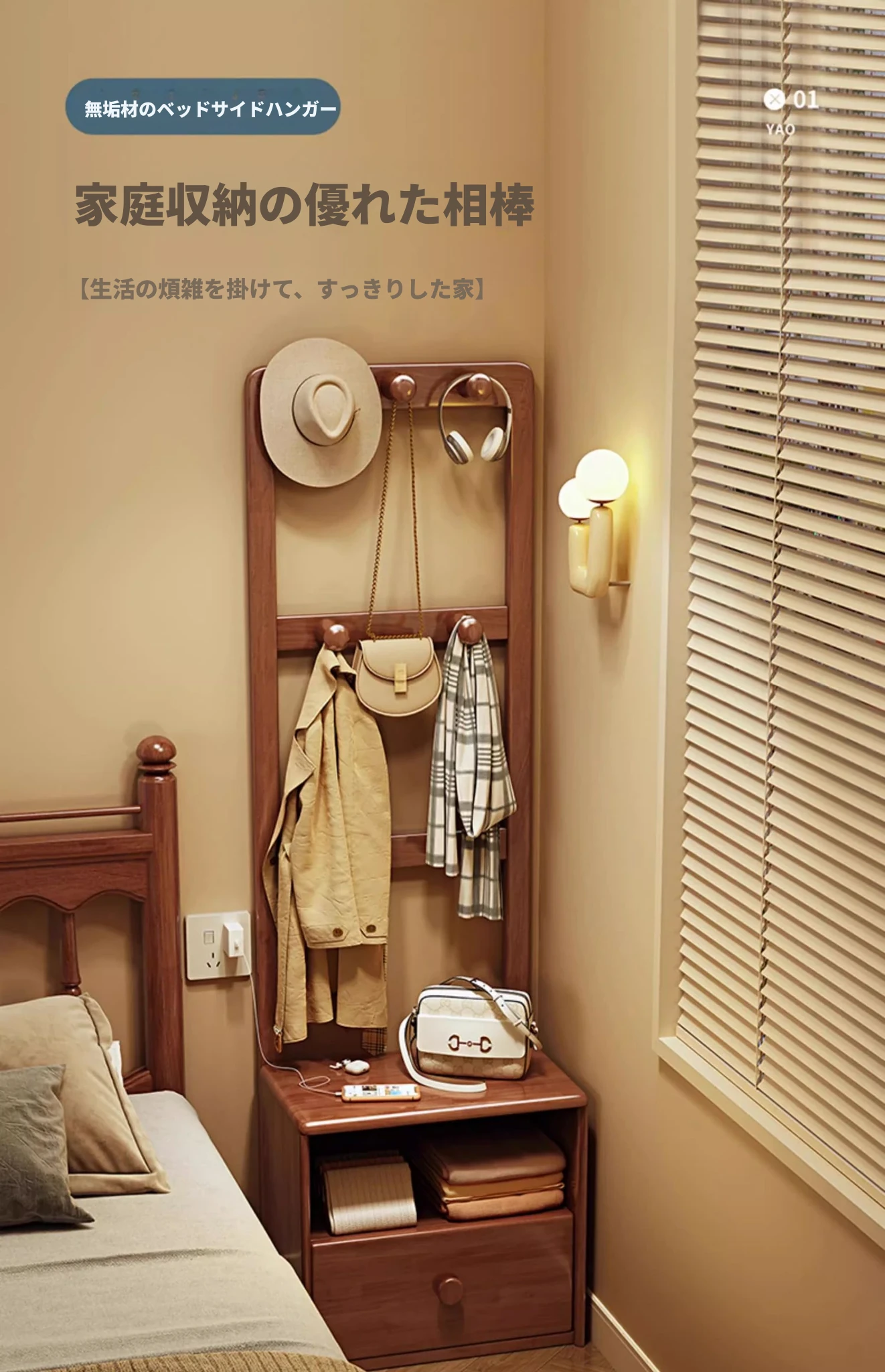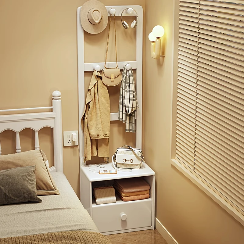 シンプルな無垢材のベッドサイドキャビネット&コートラック一体型!小さな部屋に最適な収納力を備えた、スタイリッシュな寝室用置物ラック。衣類や小物をすっきり整理して、快適な空間を実現!