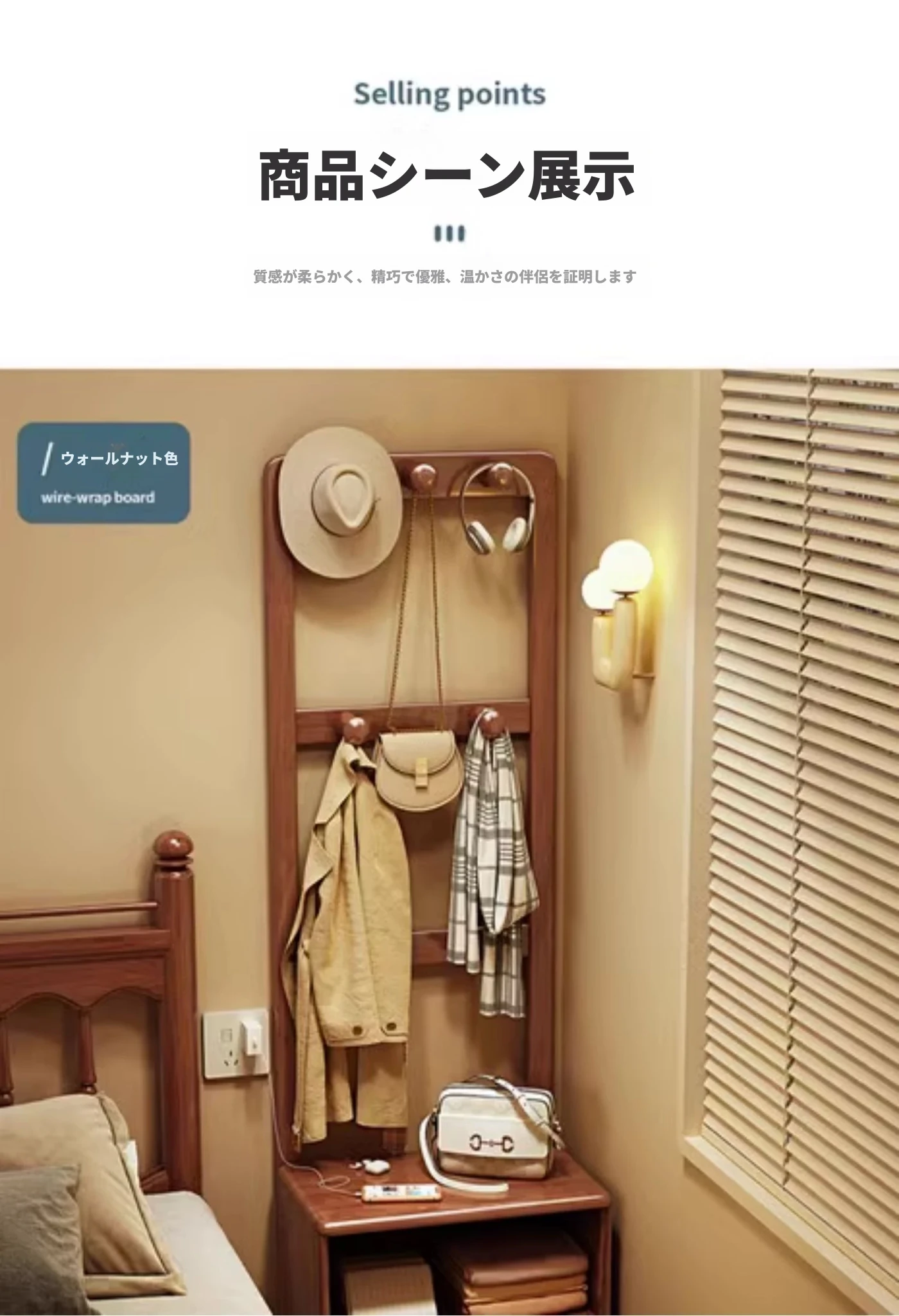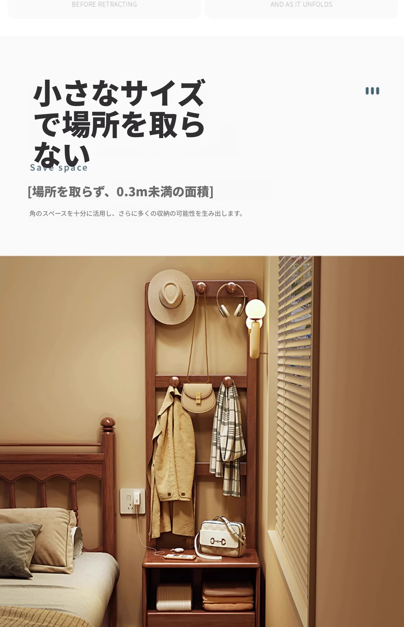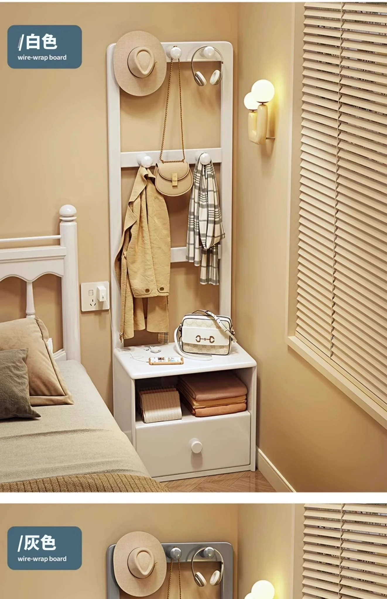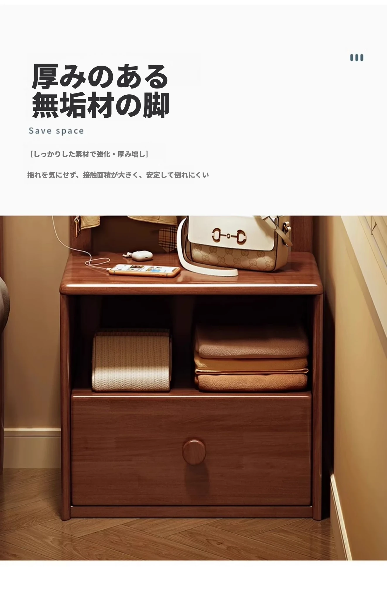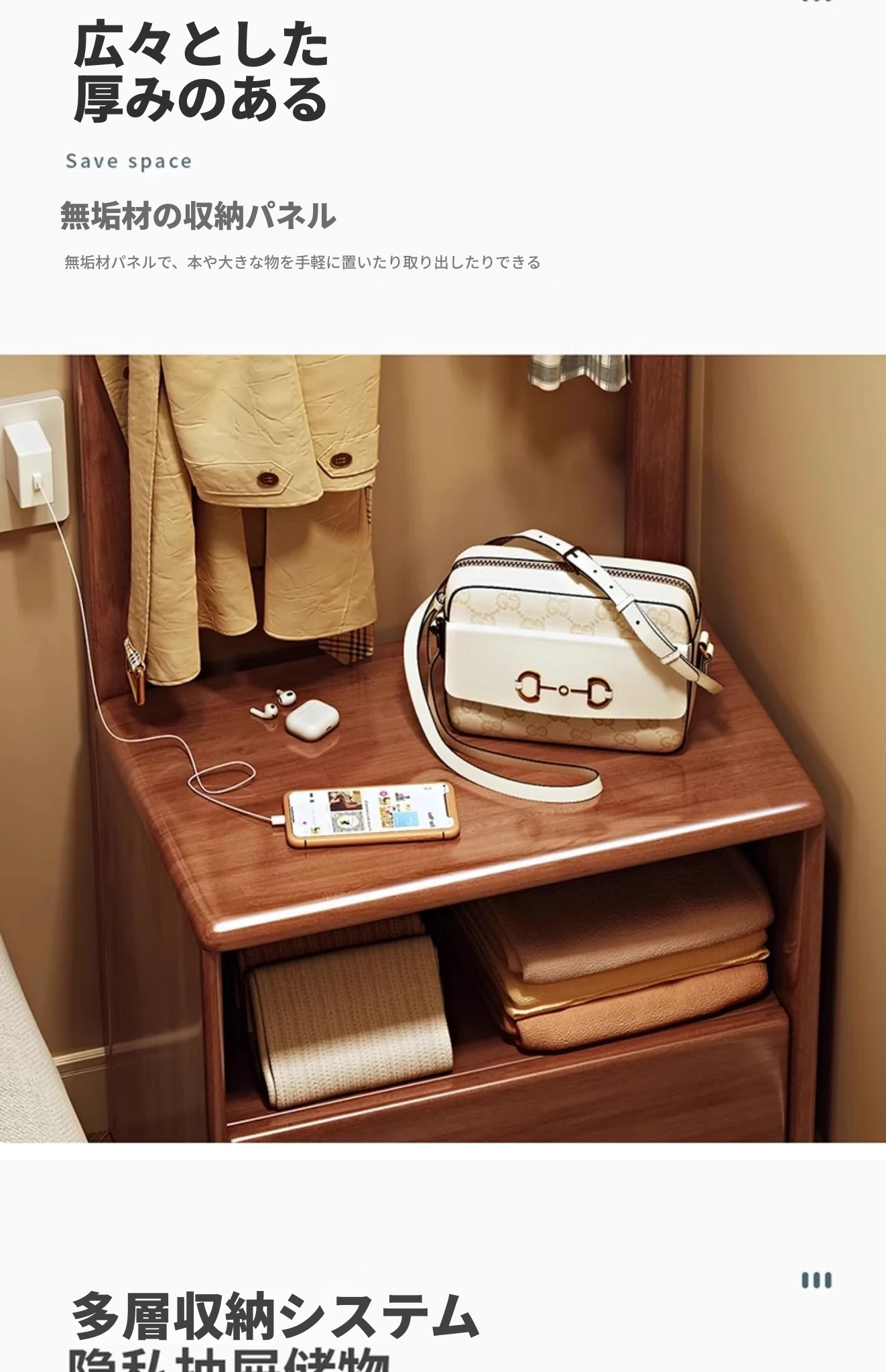 シンプルな無垢材のベッドサイドキャビネット&コートラック一体型!小さな部屋に最適な収納力を備えた、スタイリッシュな寝室用置物ラック。衣類や小物をすっきり整理して、快適な空間を実現!