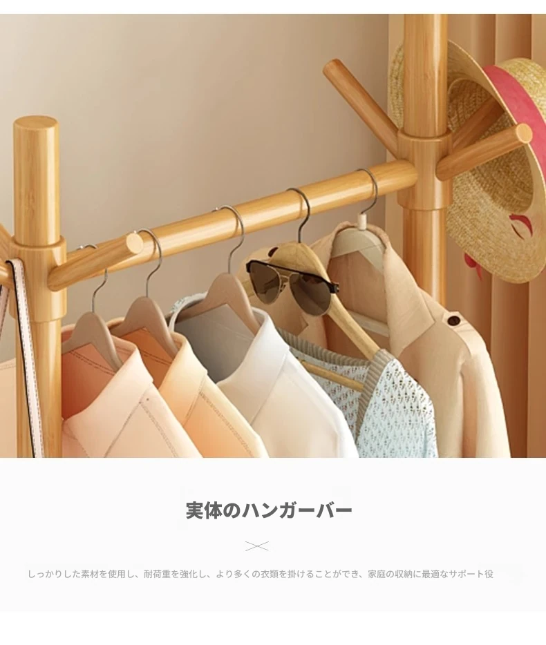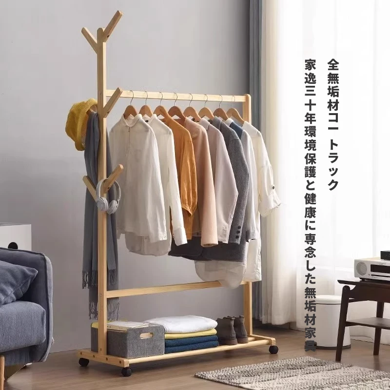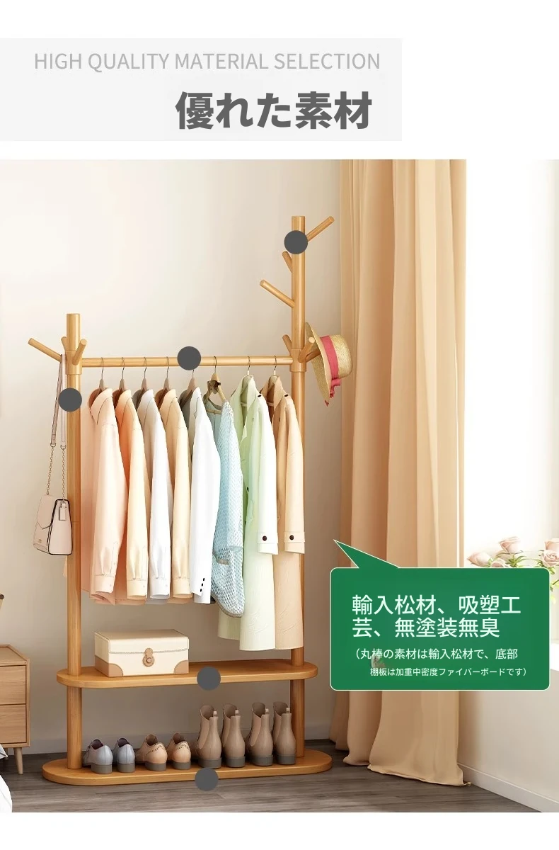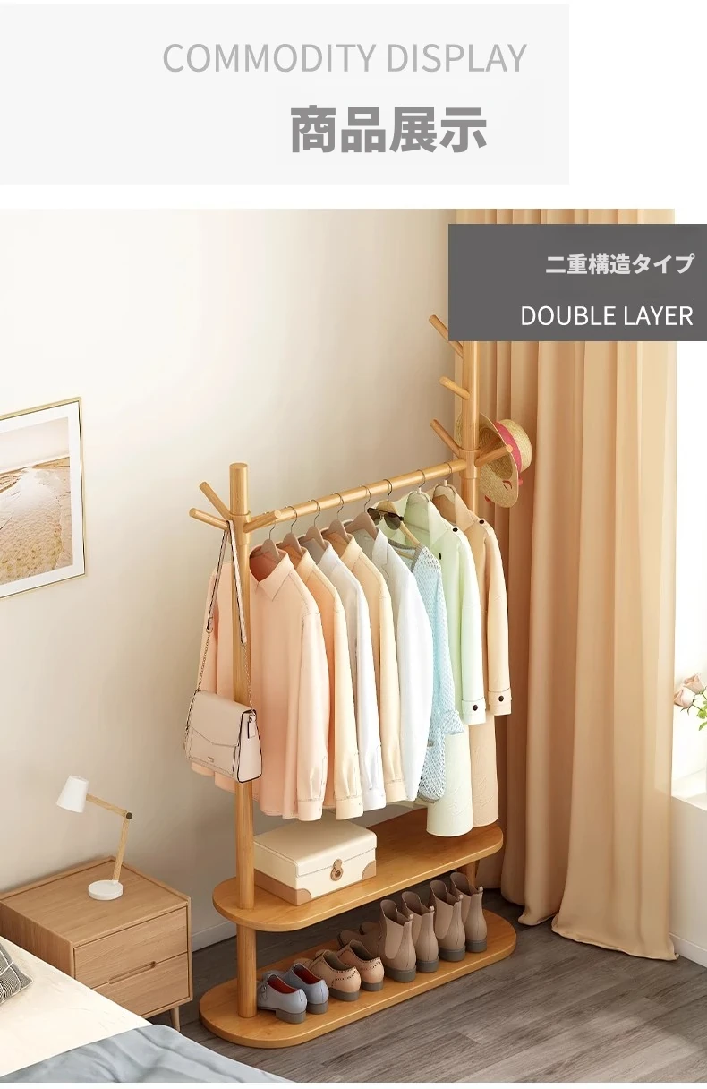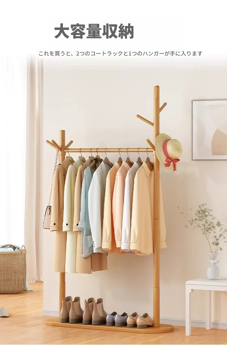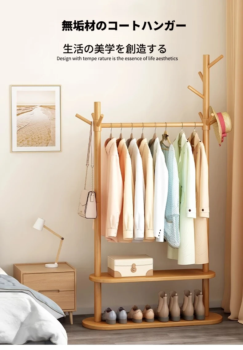 スタイリッシュな木製ハンガーラック - シンプルで使いやすい、寝室やリビングに最適な落地型衣類収納!あなたの部屋を美しく整え、衣類をすっきりと整理できます。