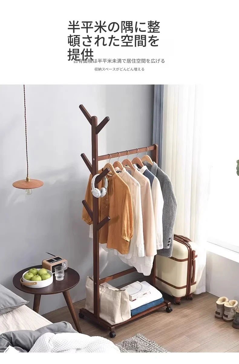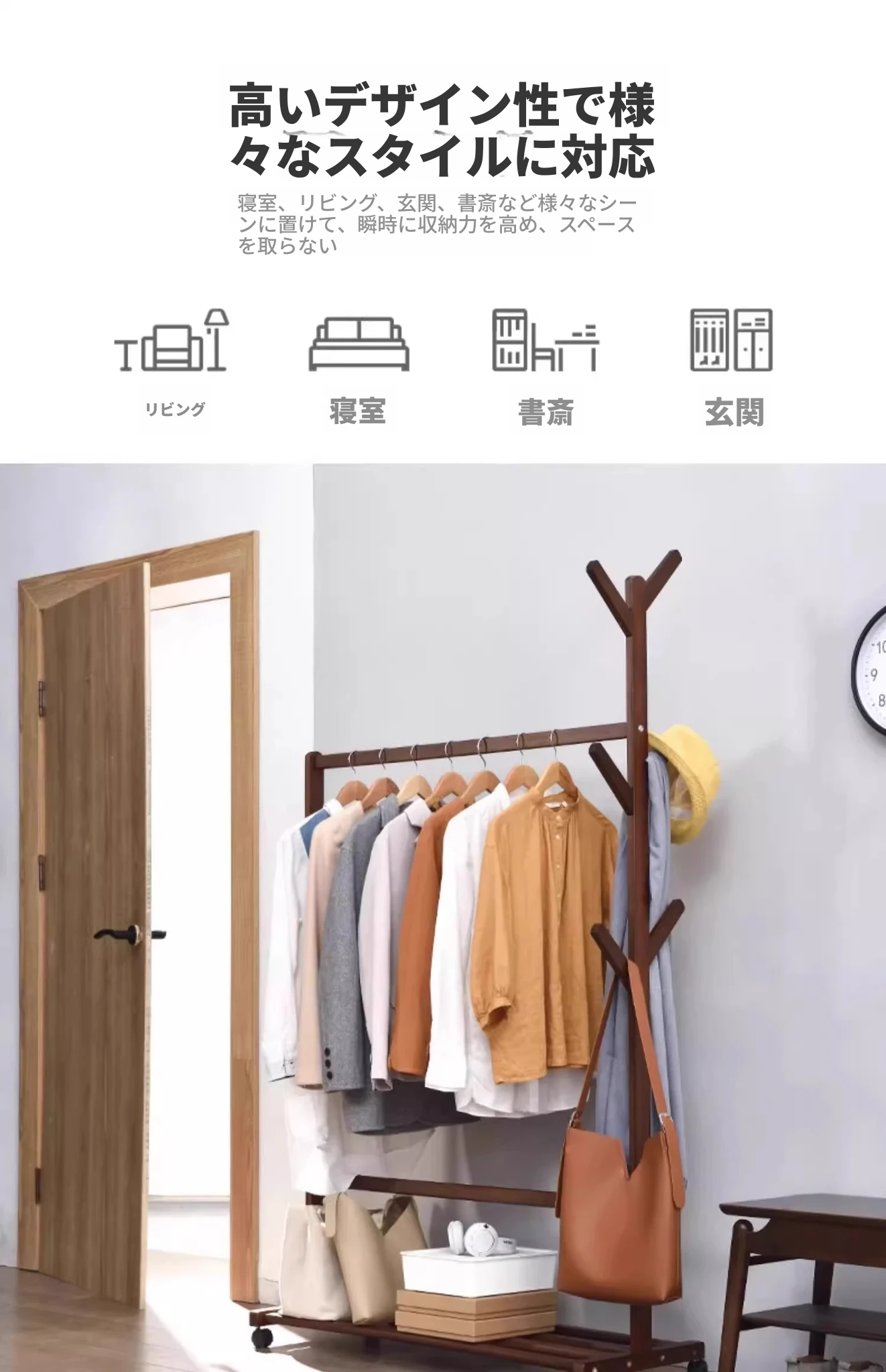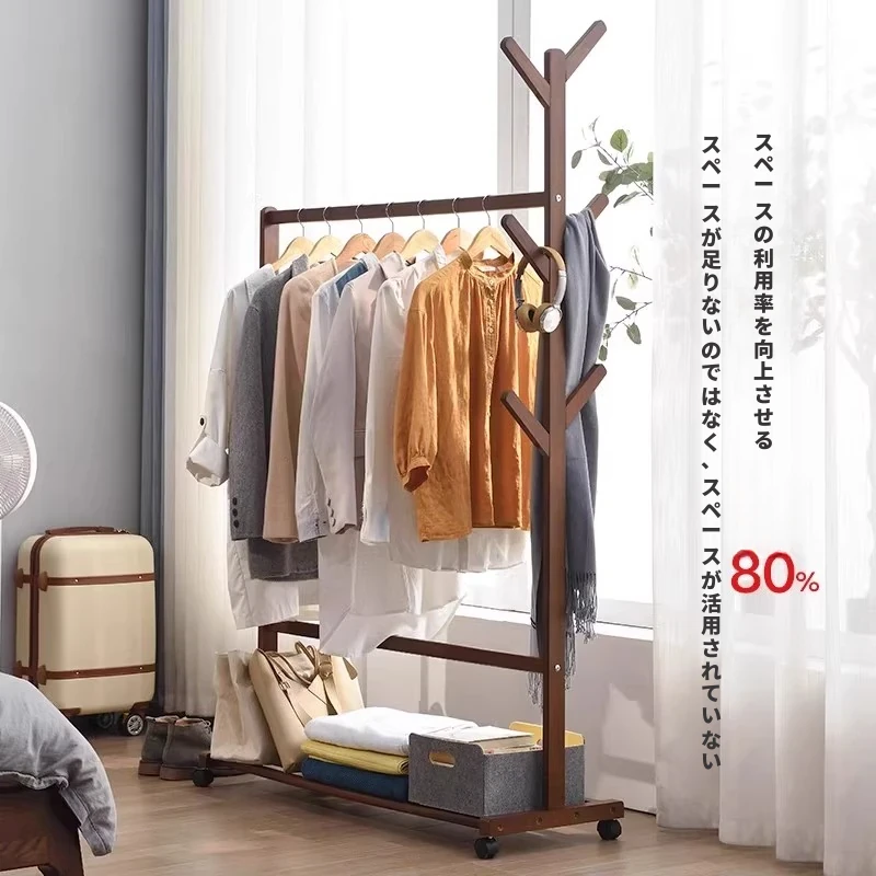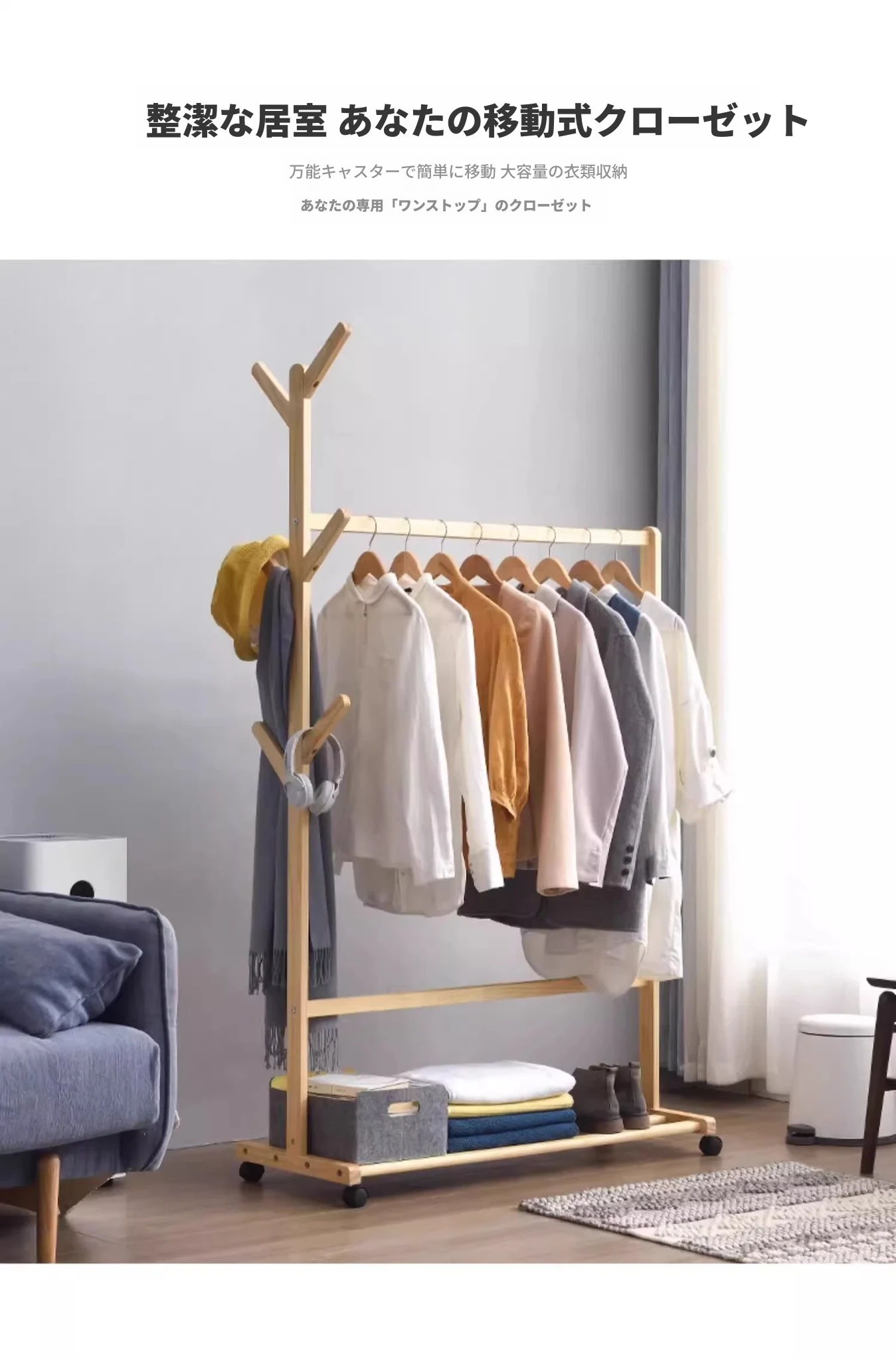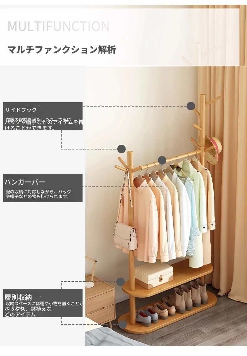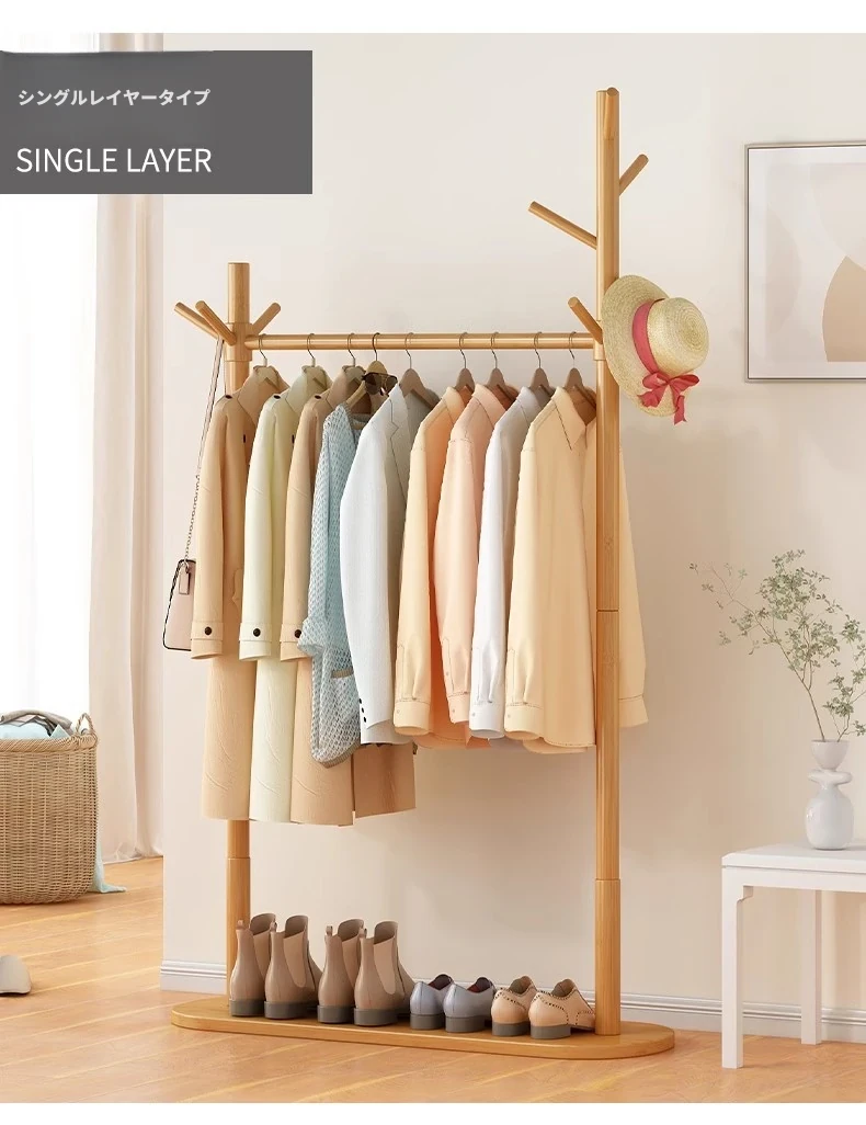 スタイリッシュな木製ハンガーラック - シンプルで使いやすい、寝室やリビングに最適な落地型衣類収納!あなたの部屋を美しく整え、衣類をすっきりと整理できます。