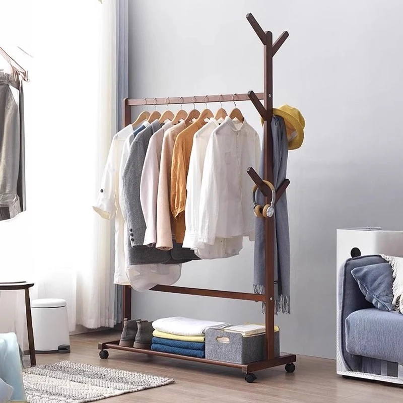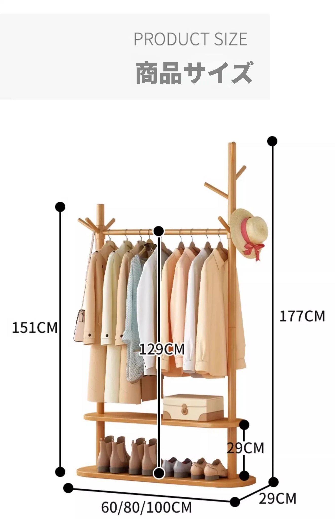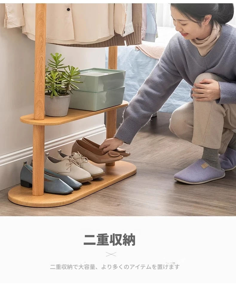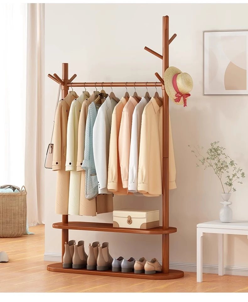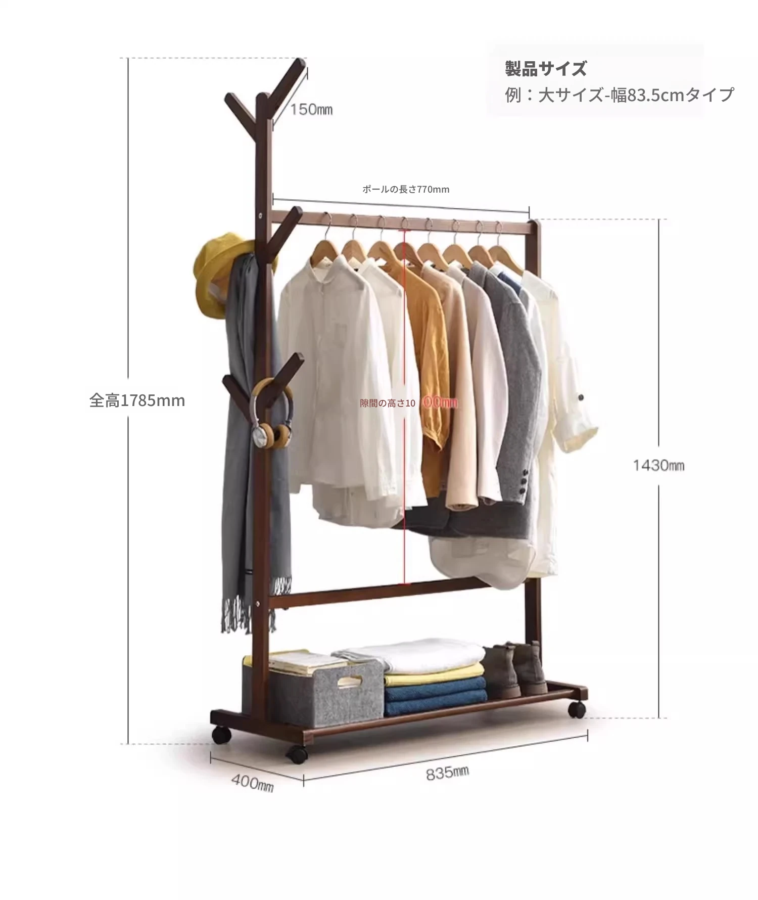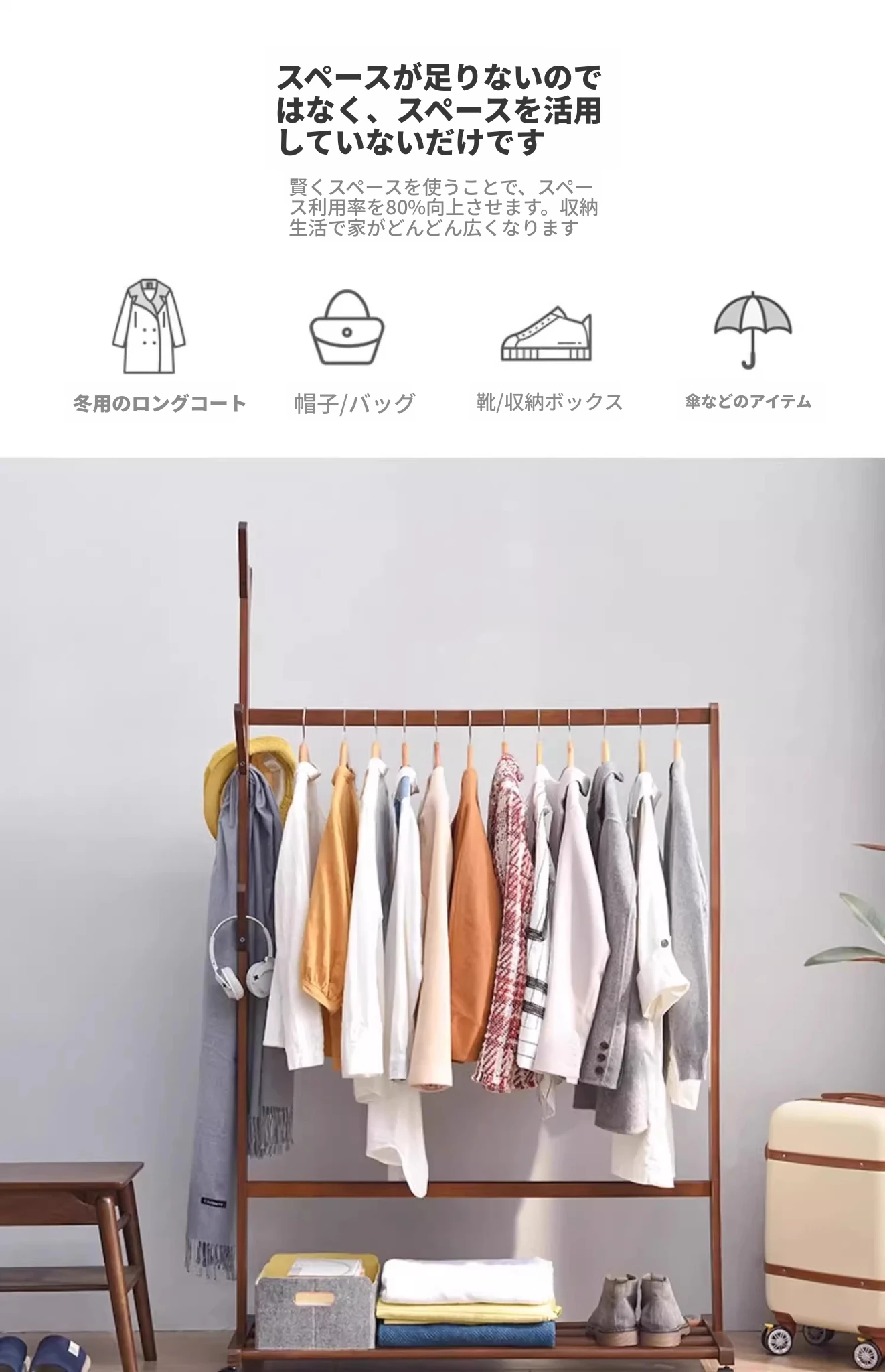 スタイリッシュな木製ハンガーラック - シンプルで使いやすい、寝室やリビングに最適な落地型衣類収納!あなたの部屋を美しく整え、衣類をすっきりと整理できます。