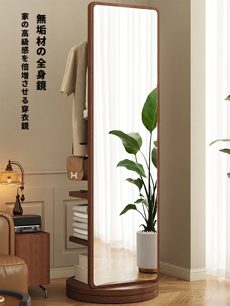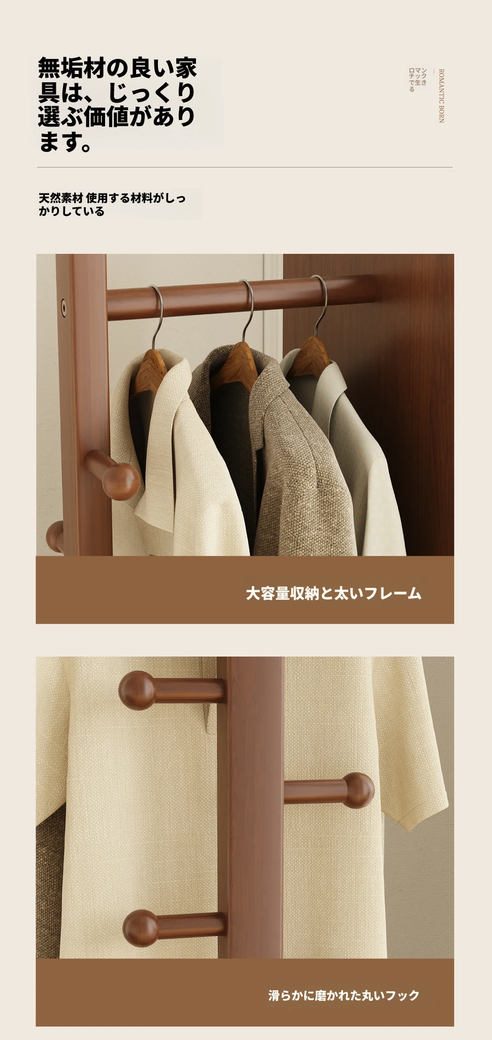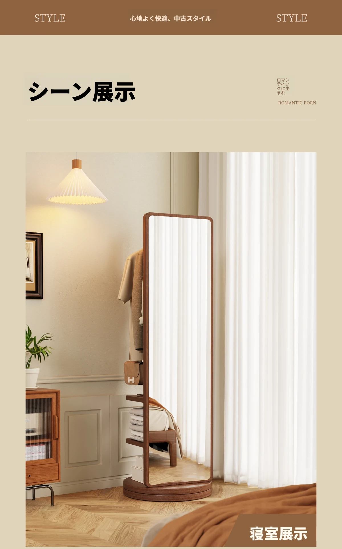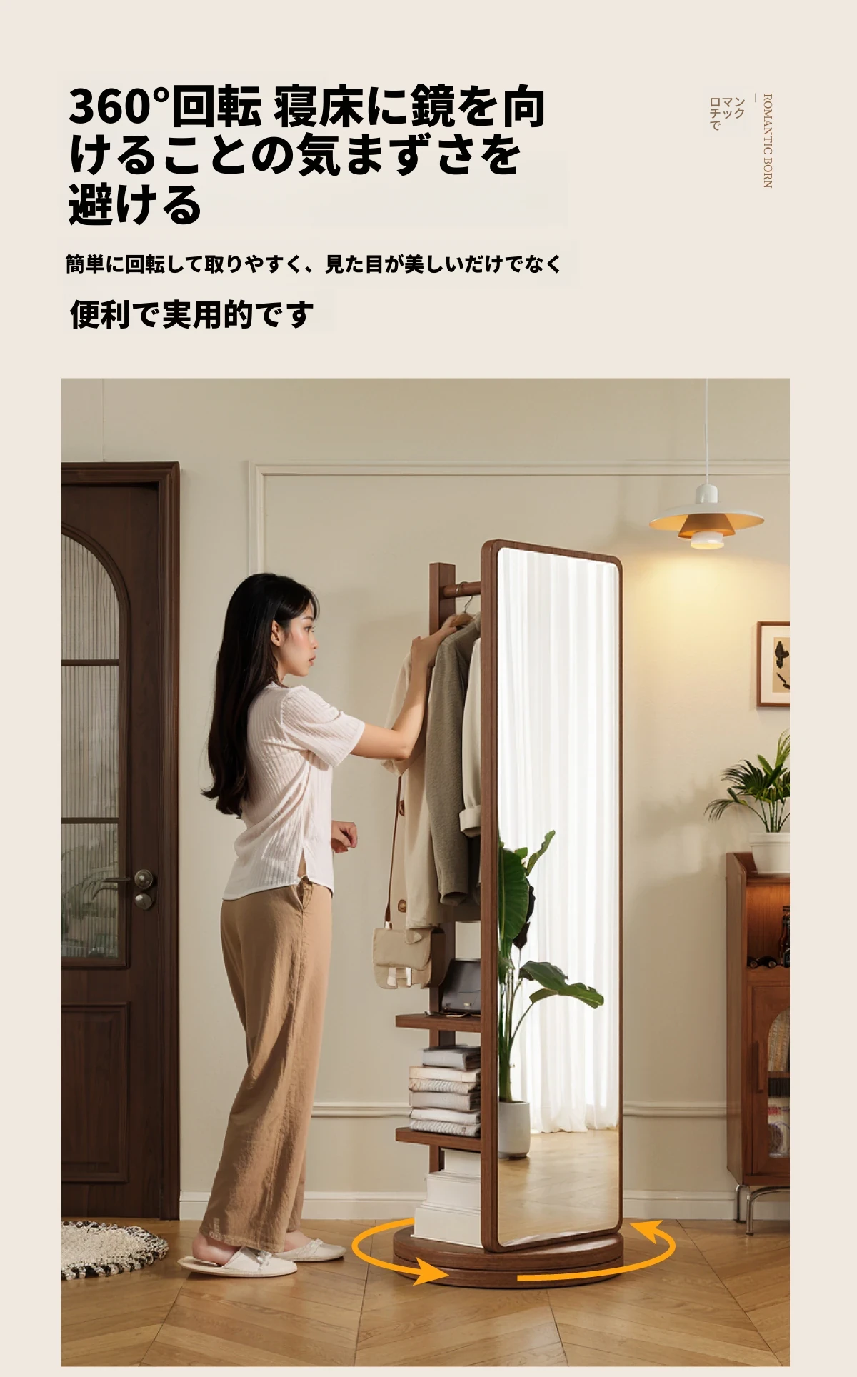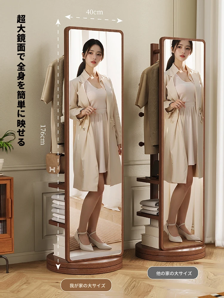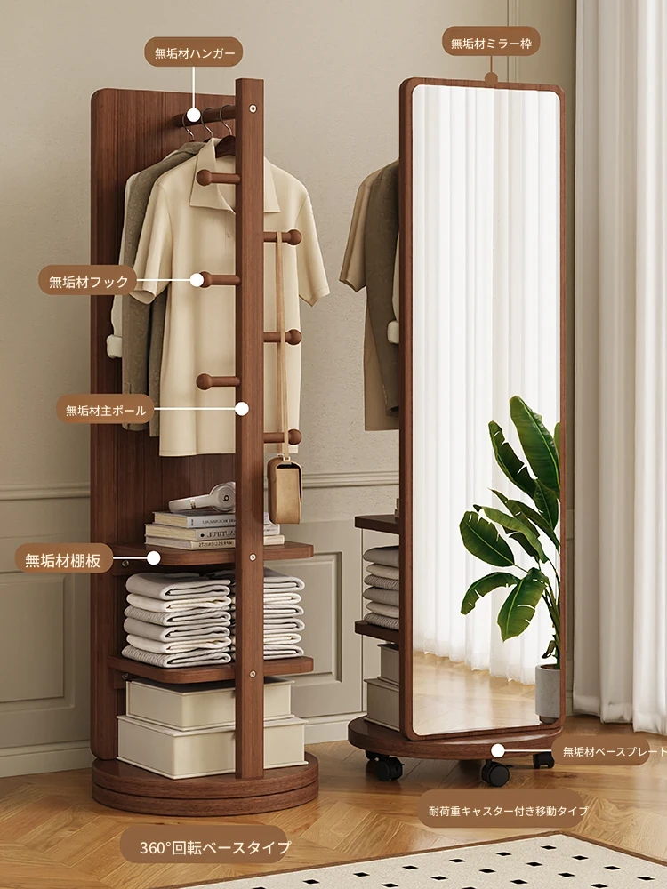 高品質な無垢材使用!全身鏡と衣類ラックが一体化したスタイリッシュなドレッシングミラー。回転可能で移動も簡単、あなたの寝室をおしゃれに演出します。大きな試着スペースで、毎日のコーディネートを楽しんで!