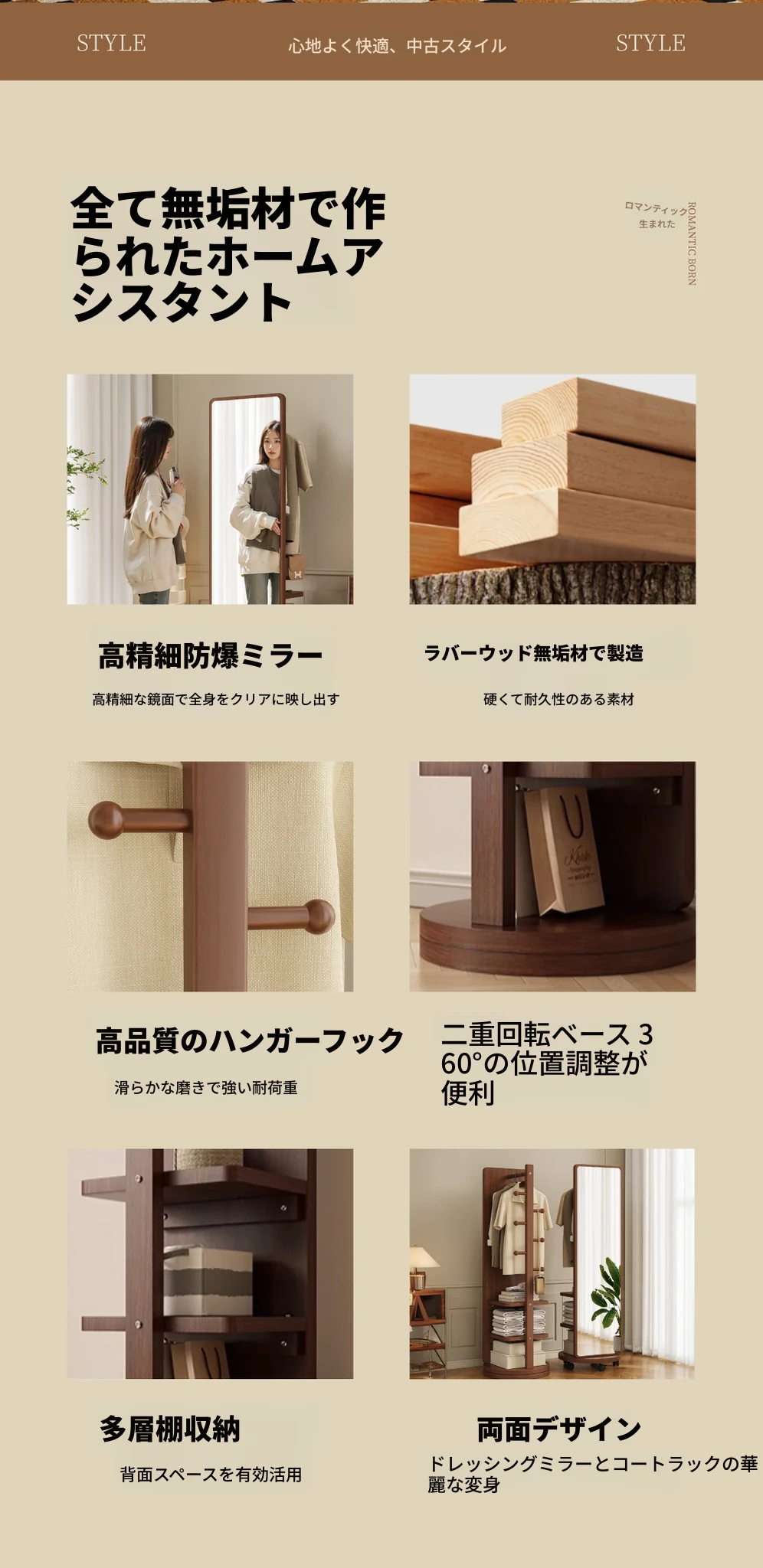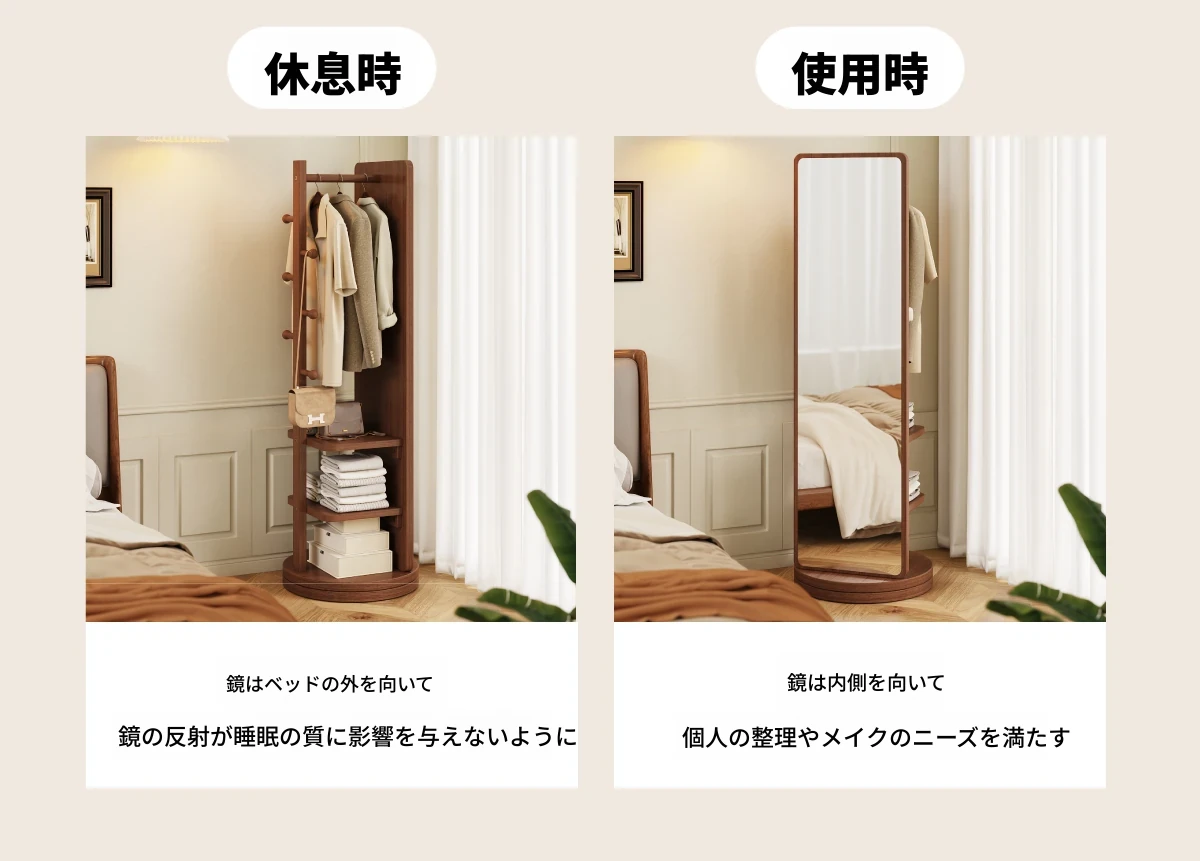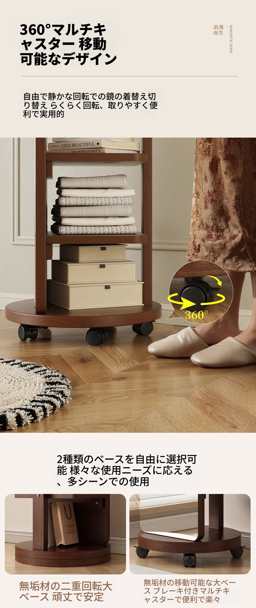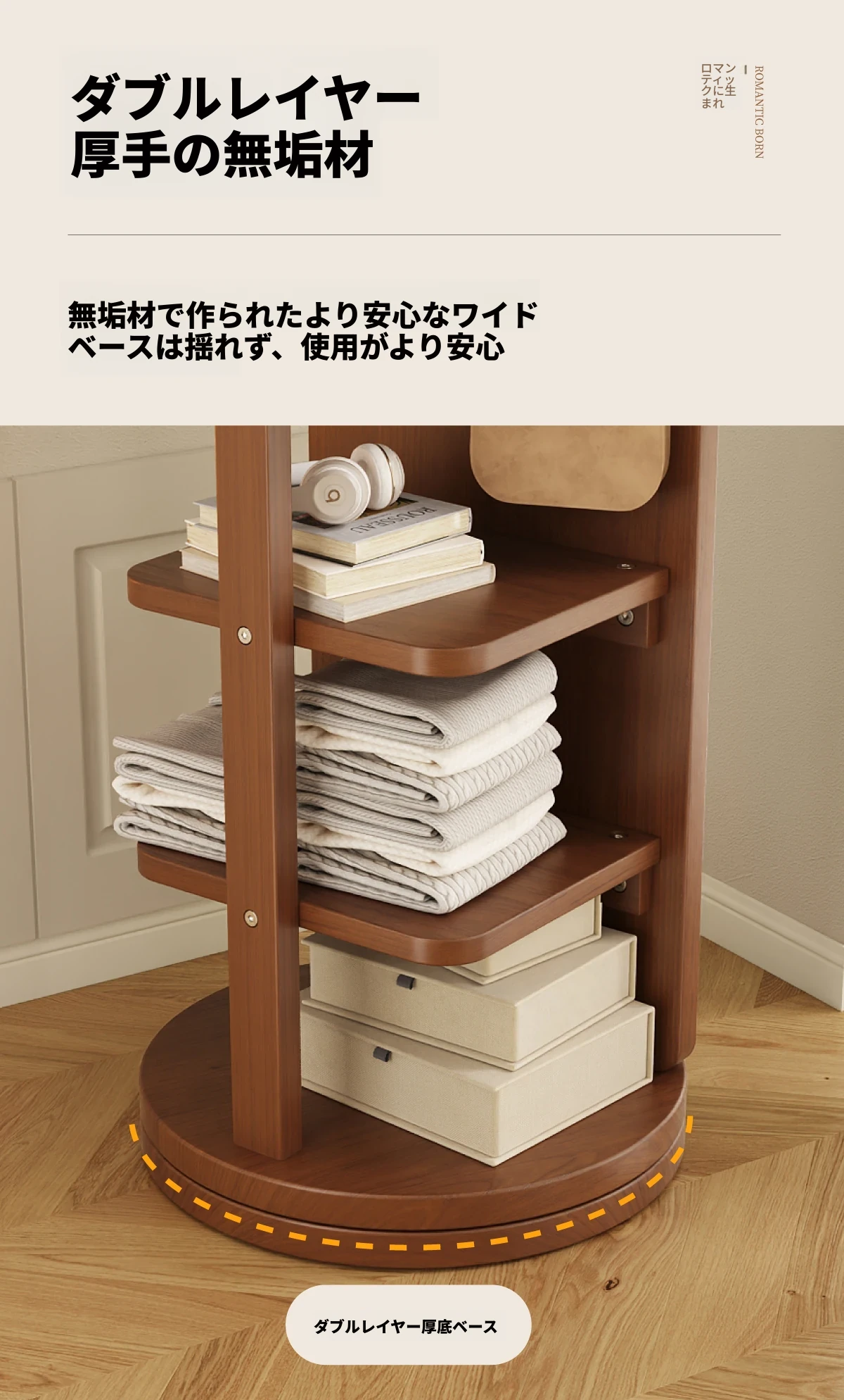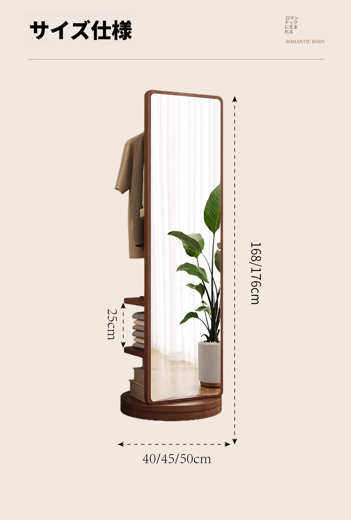 高品質な無垢材使用!全身鏡と衣類ラックが一体化したスタイリッシュなドレッシングミラー。回転可能で移動も簡単、あなたの寝室をおしゃれに演出します。大きな試着スペースで、毎日のコーディネートを楽しんで!