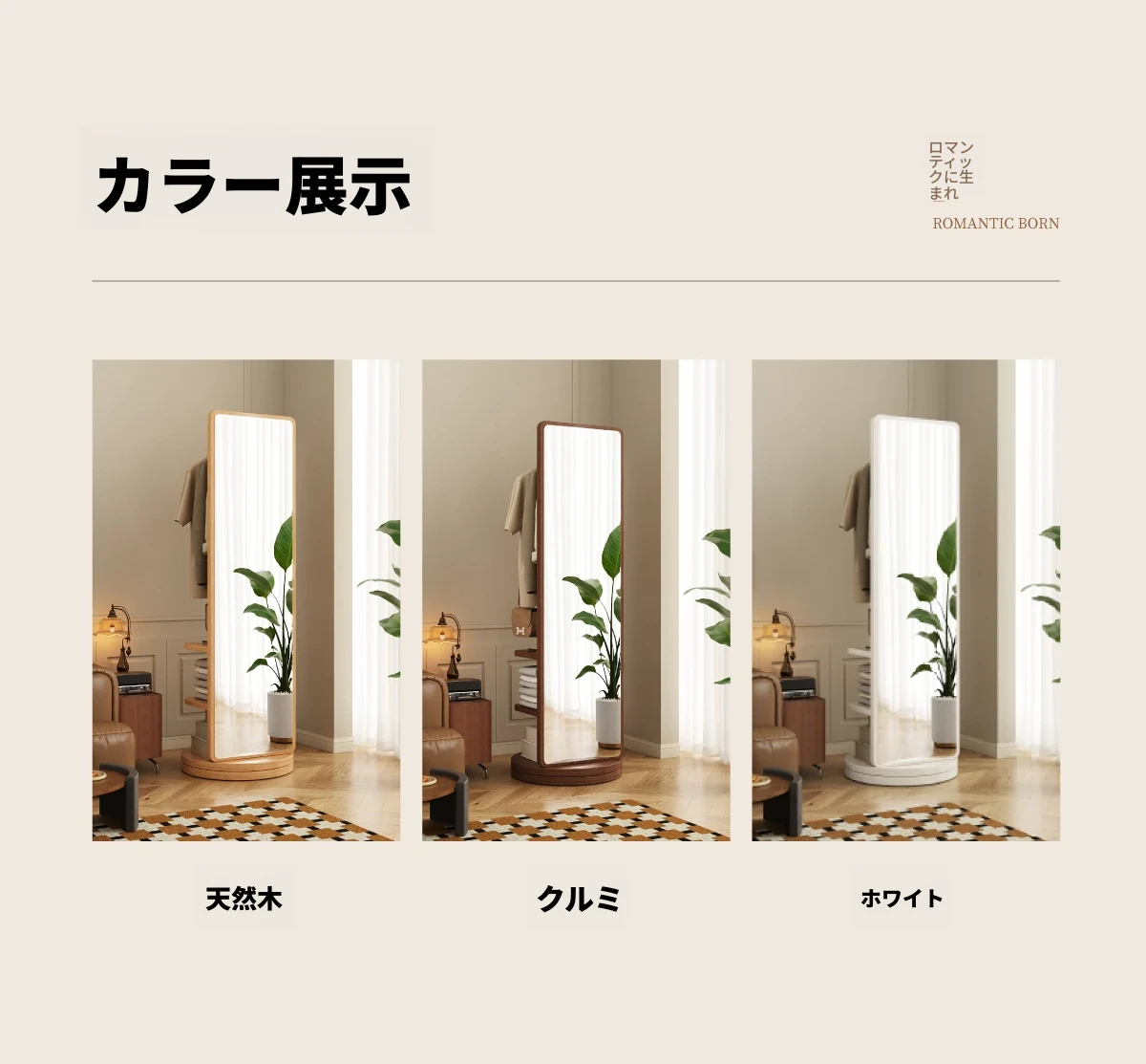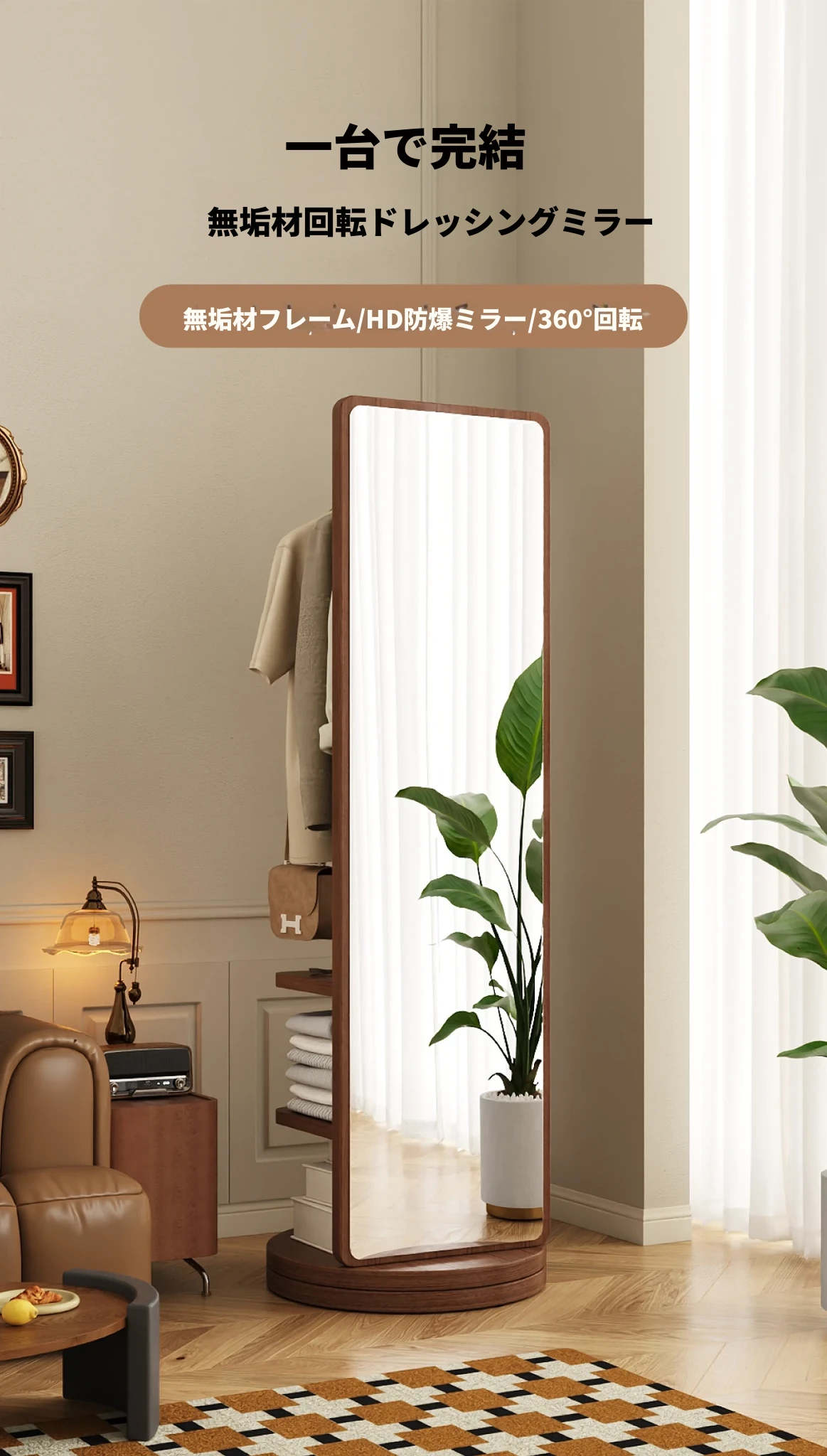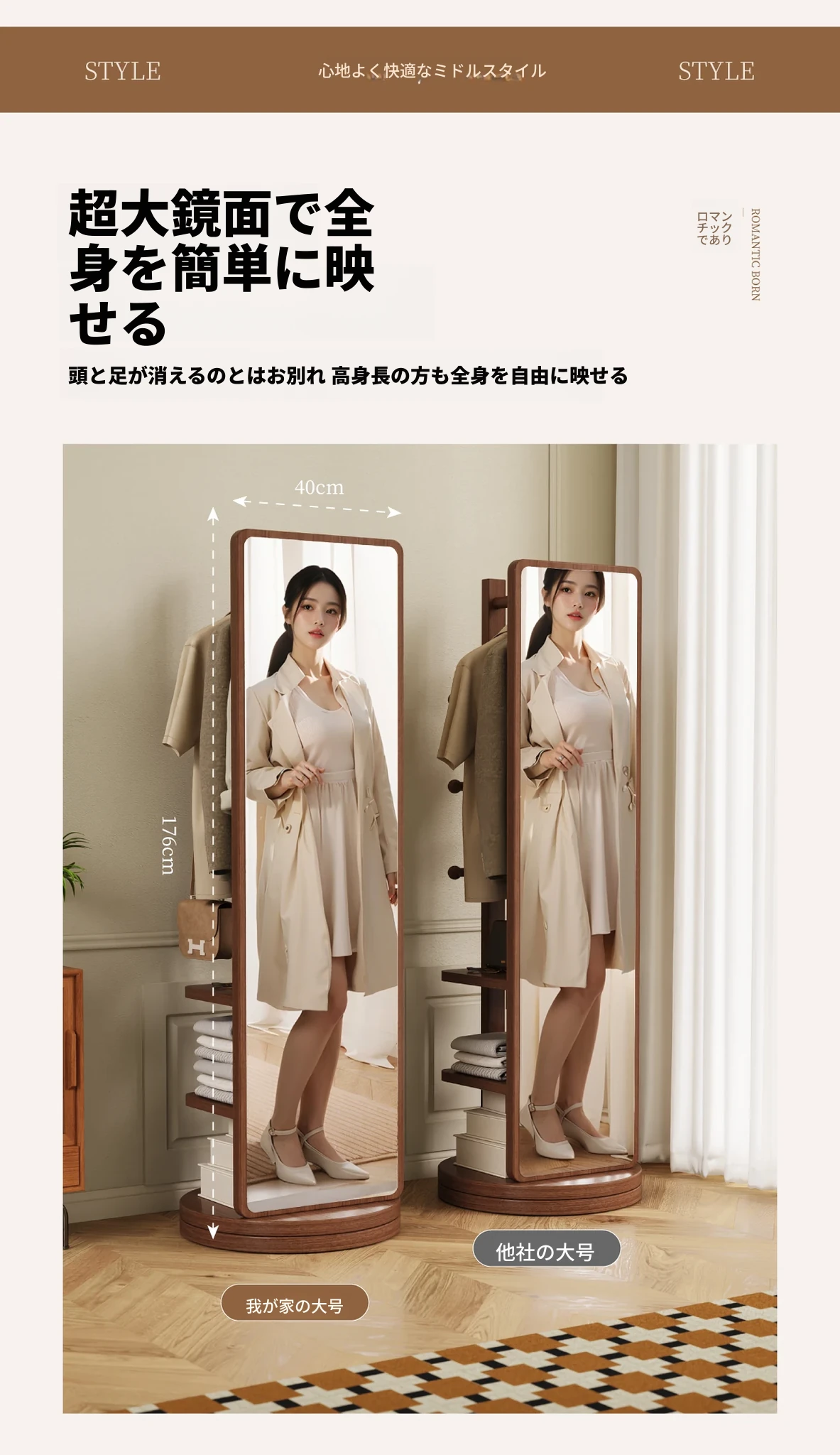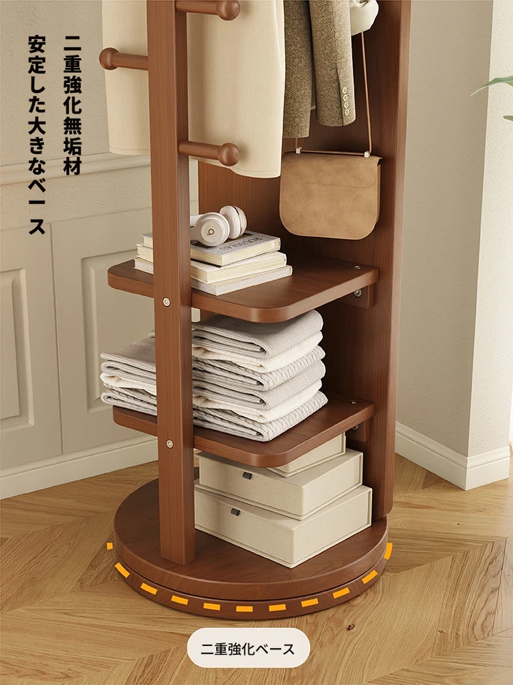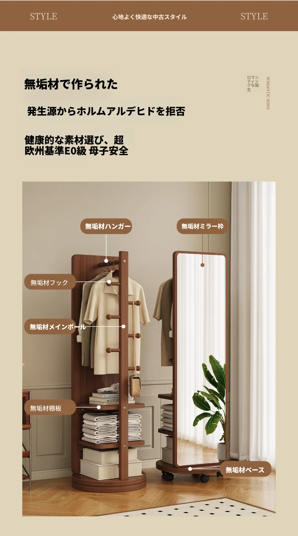 高品質な無垢材使用!全身鏡と衣類ラックが一体化したスタイリッシュなドレッシングミラー。回転可能で移動も簡単、あなたの寝室をおしゃれに演出します。大きな試着スペースで、毎日のコーディネートを楽しんで!