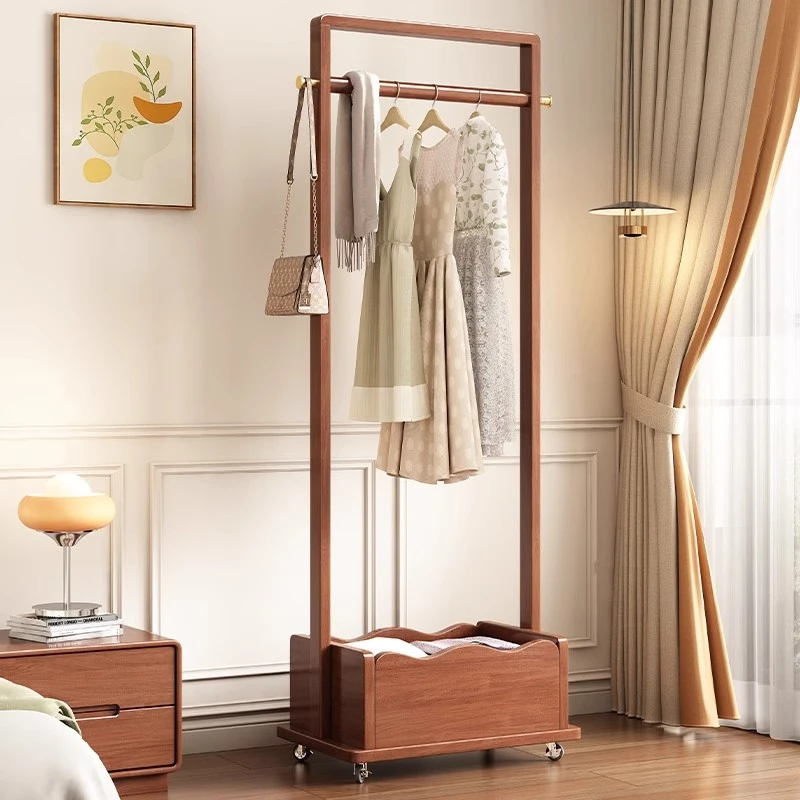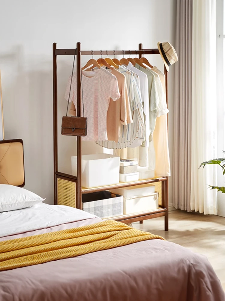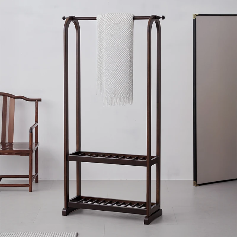 新中式デザインの無垢材スタンドハンガー - 寝室やリビングにぴったり!ベッドサイドでの衣類置きに最適、エレガントな収納ソリューション。おしゃれで機能的な衣帽掛け!