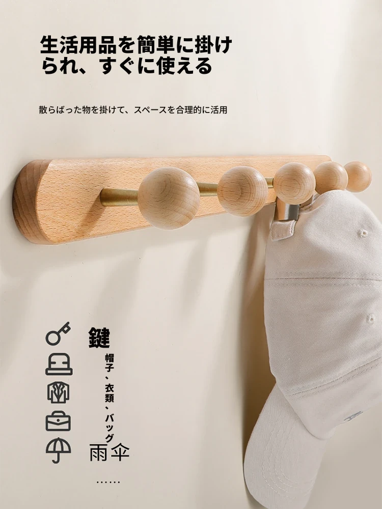防止壁面损伤!進入時の便利な木製フック、玄関に最適な壁掛けコートハンガー。穴を開けずに取り付けられ、衣類や帽子をスッキリ収納!